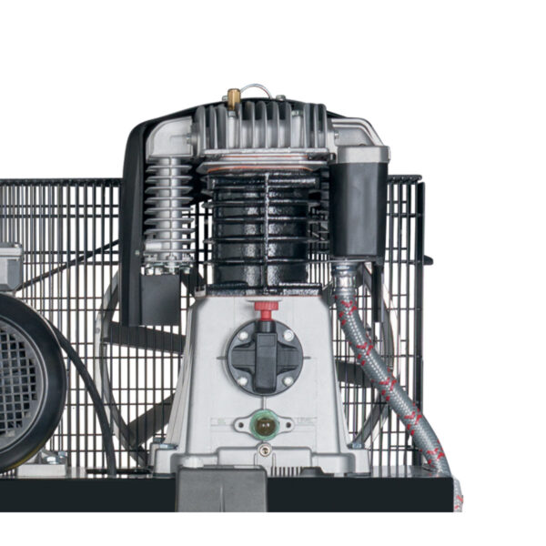 - Nachkühler mit großen Kühllamellen bewirkt niedrige Kesseleintrittstemperatur und weniger Feuchtigkeit in der Druckluft zur Schonung der Druckluftwerkzeuge
