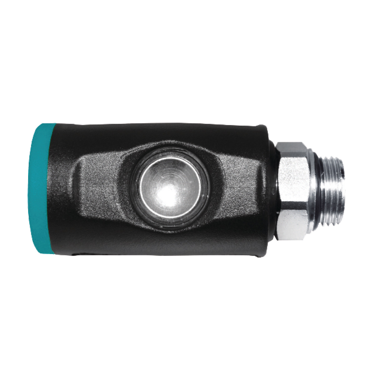 - Mit einem Knopfdruck wird der Druck abgebaut, mit einem weiteren Knopfdruck werden Druckluftsysteme und -Werkzeuge sicher abgetrennt