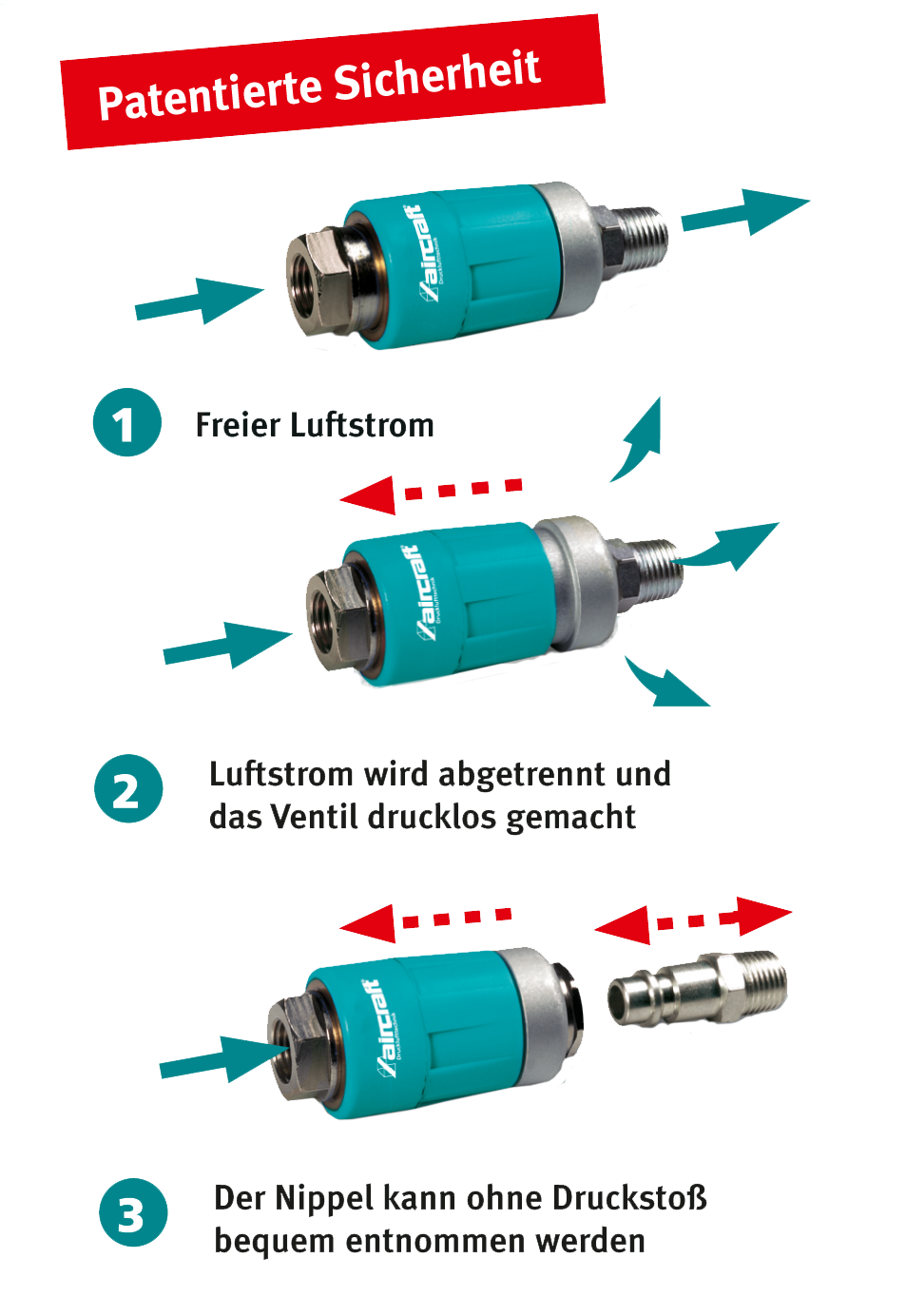 - AIRCRAFT setzt als erster Hersteller an allen Druckluftentnahmestellen der Airprofi-Serie Einhand-Sicherheitskupplungen serienmäßig ein.
