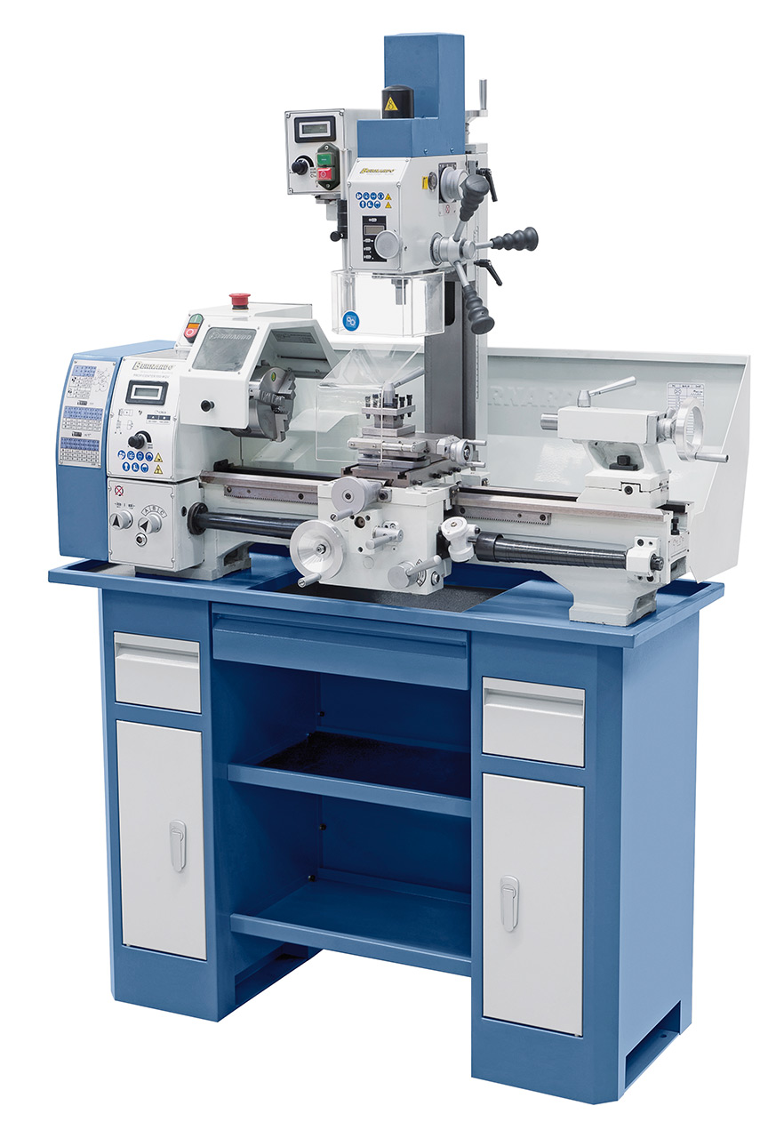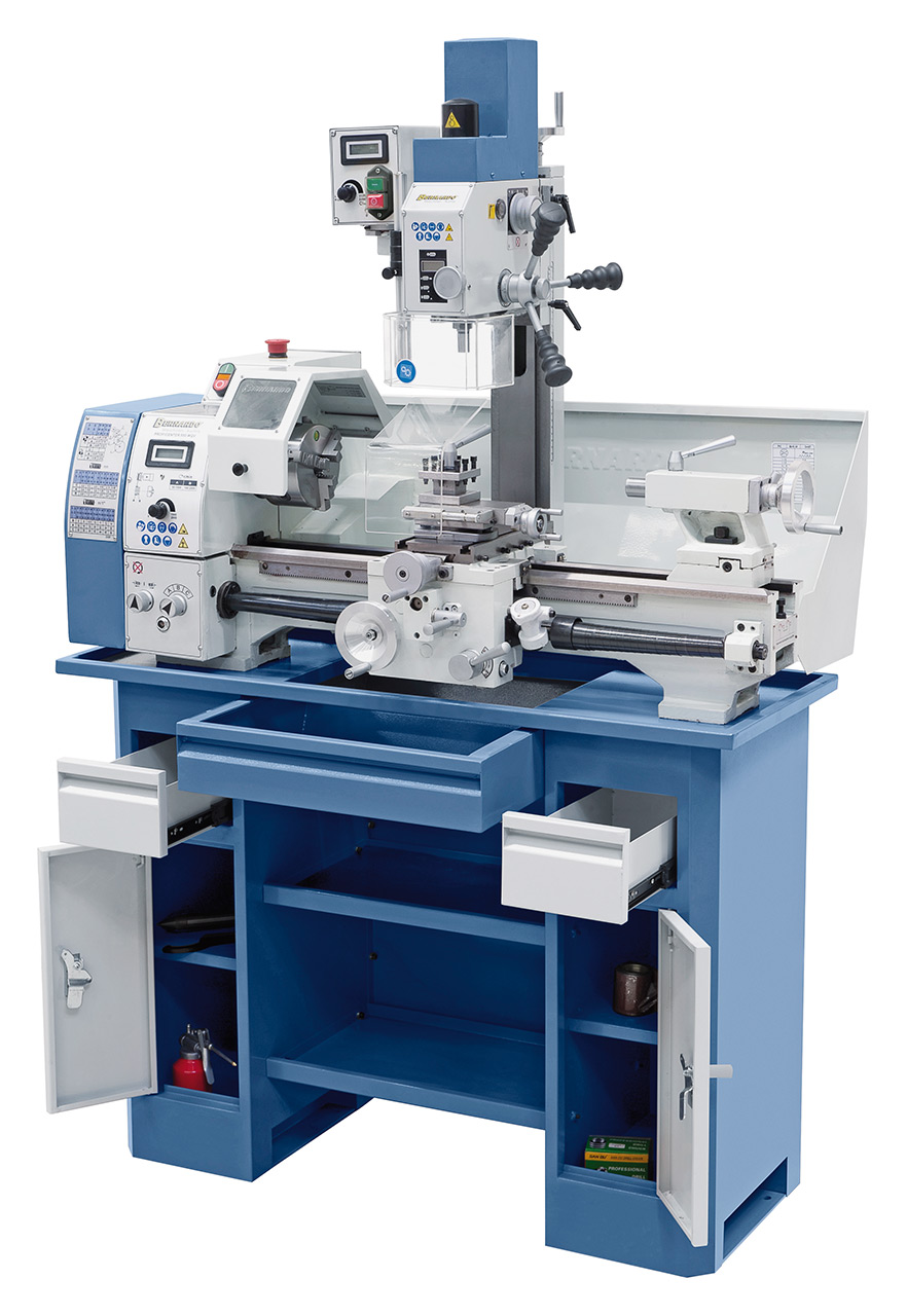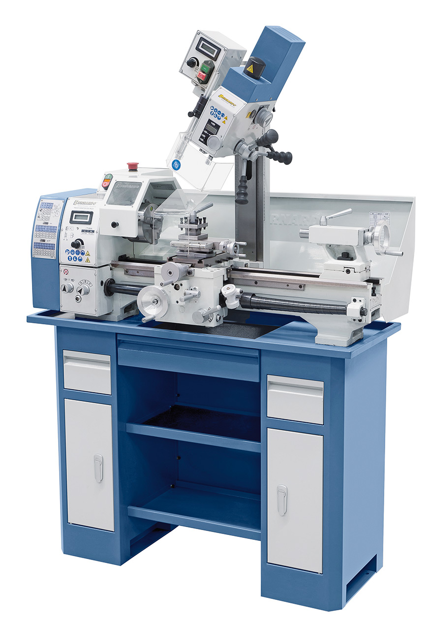 Das Bearbeitungszentrum Proficenter 550 WQV lässt für Feinmechaniker, Ausbildungs- und Lehrwerkstätten, usw. keine Wünsche offen. Bohren, Fräsen und Drehen auf kleinstem Raum, serienmäßig mit digitaler Anzeige für Bohrtiefe und Drehzahl zum komfortablen Arbeiten, sowie eine große Spindelbohrung, alles kombiniert in einer Maschine.