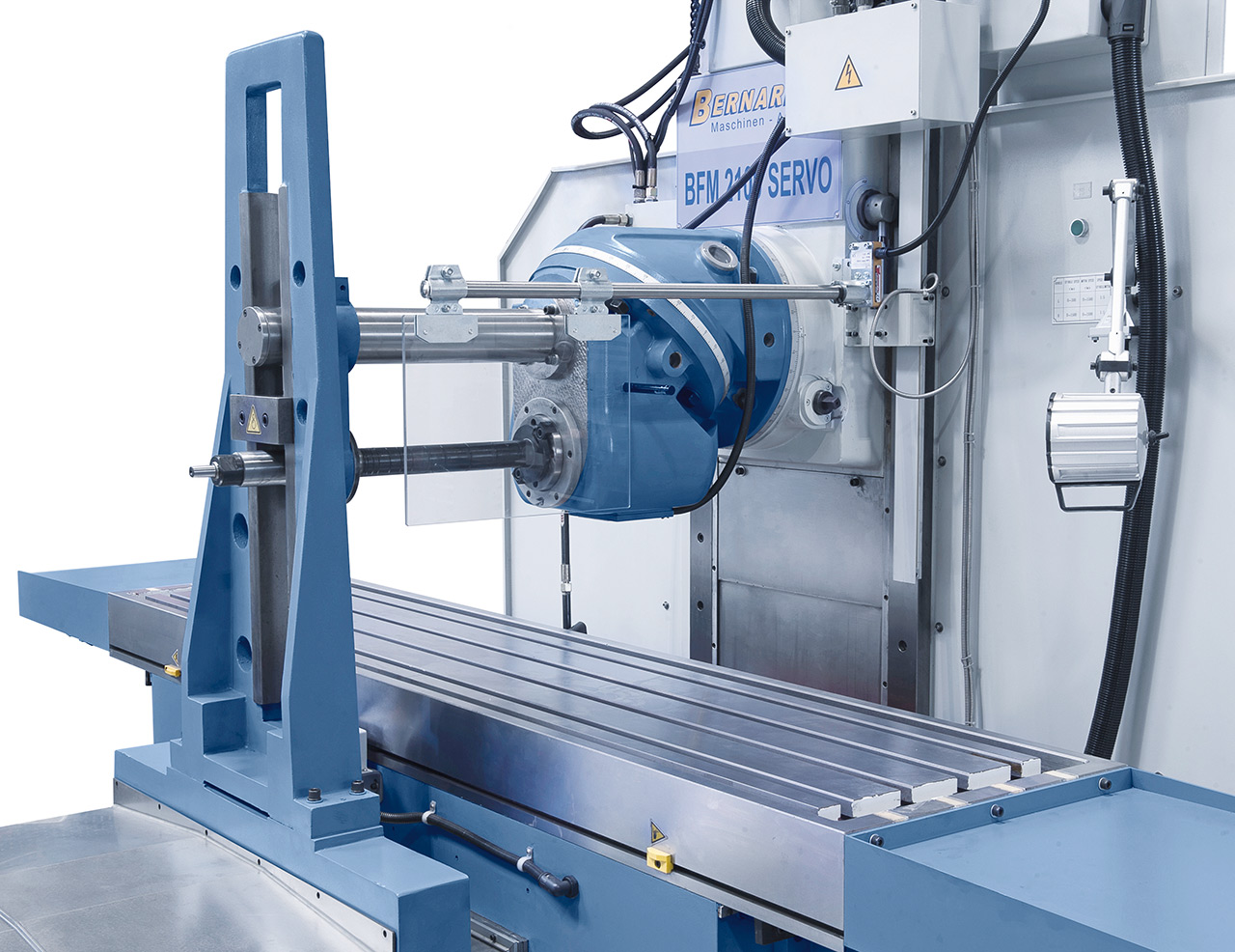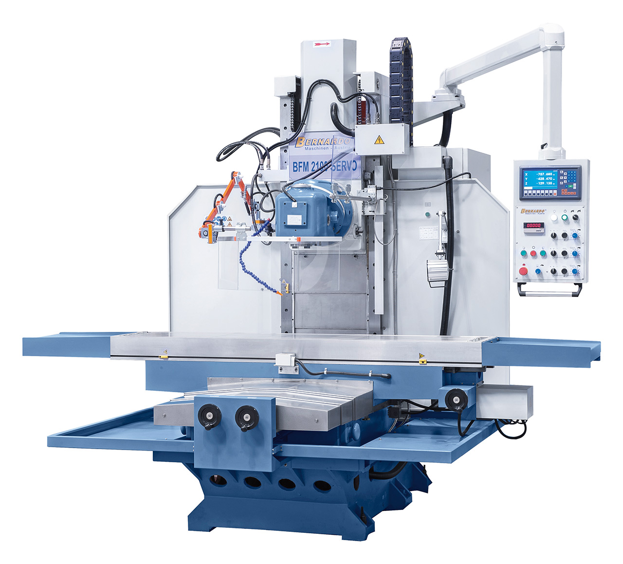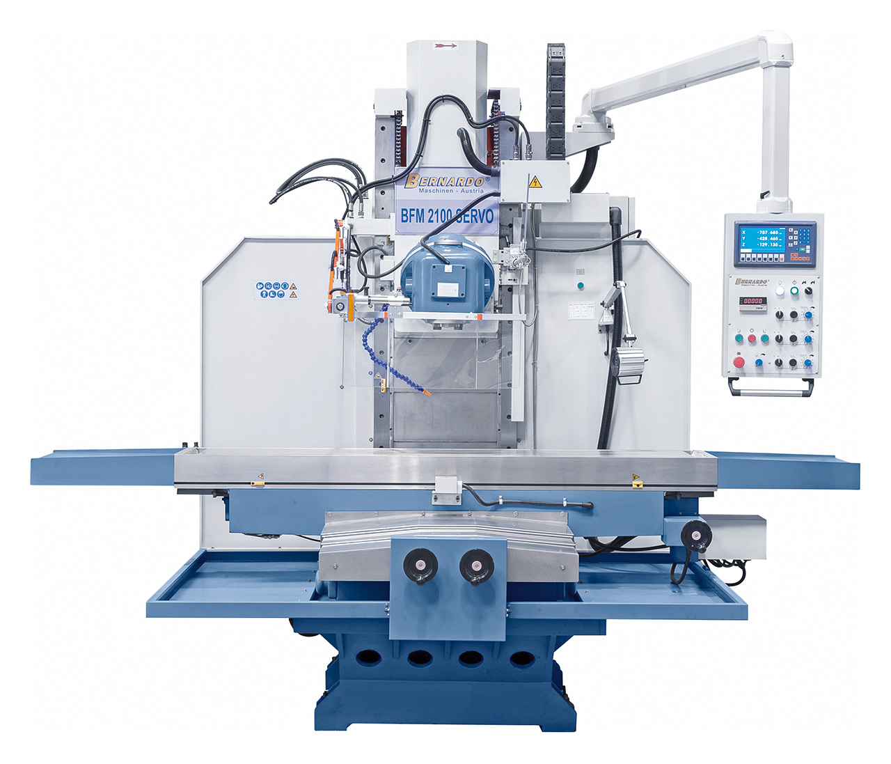 Die servo-konventionelle Bettfräsmaschine BFM 2100 Servo überzeugt durch die massive und schwere Graugusskonstruktion, wodurch diese Maschine für eine schwere Zerspanung bei großen Werkstücken optimal geeignet ist. Hauptmerkmale dieses Modells ist der Servoantrieb in allen Achsen, der großzügig dimensionierte Arbeitstisch sowie die großen Verfahrwege.