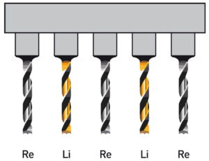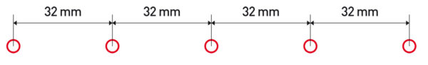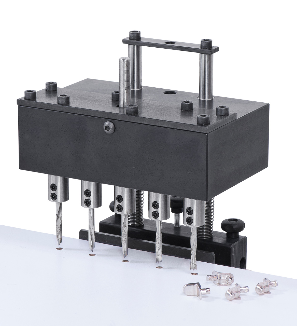 Dieser Reihenbohrkopf ist mit fünf Spindeln ausgestattet, zum Ausführen einer Serie von fünf Löchern gleichzeitig mit einem Achsabstand von 32 mm. Diese Ausrüstung wird beim Bohren von Möbelseitenteilen als auch zur Befestigung der Scharnierbasis verwendet.