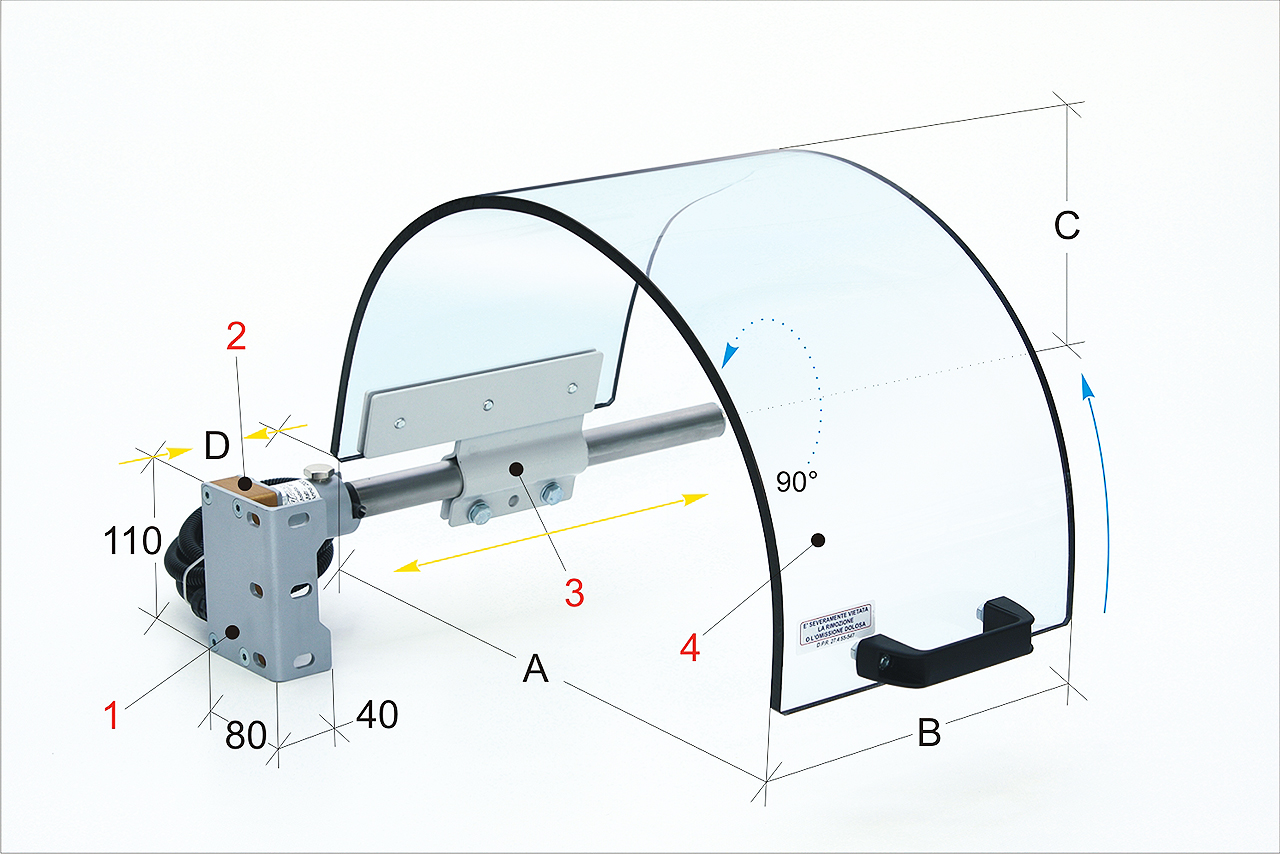 - Das Modell PTO 02 wird direkt am Spindelkopf montiert. Der Schirm besteht aus schlagfestem und ölbeständigem Kunststoffmaterial.