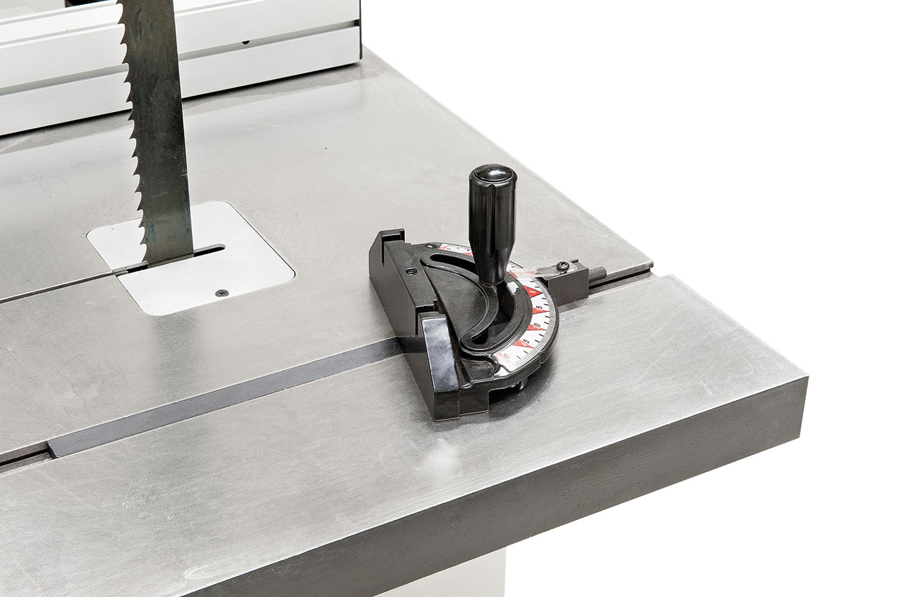 • Großdimensionierter Sägetisch aus Grauguss, schwenkbar von -5° bis +45°