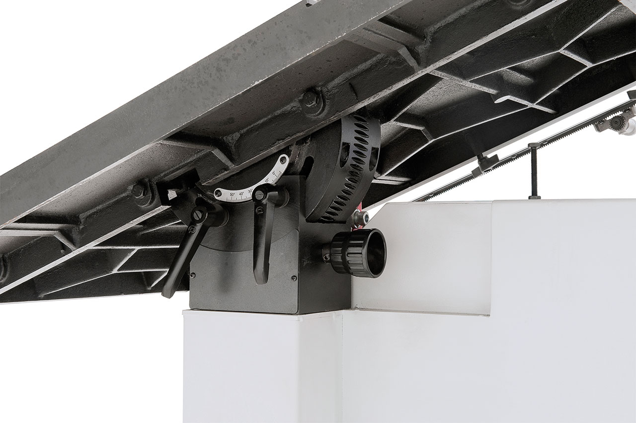 - Großdimensionierter Sägetisch aus Grauguss, schwenkbar von -5° bis +45°