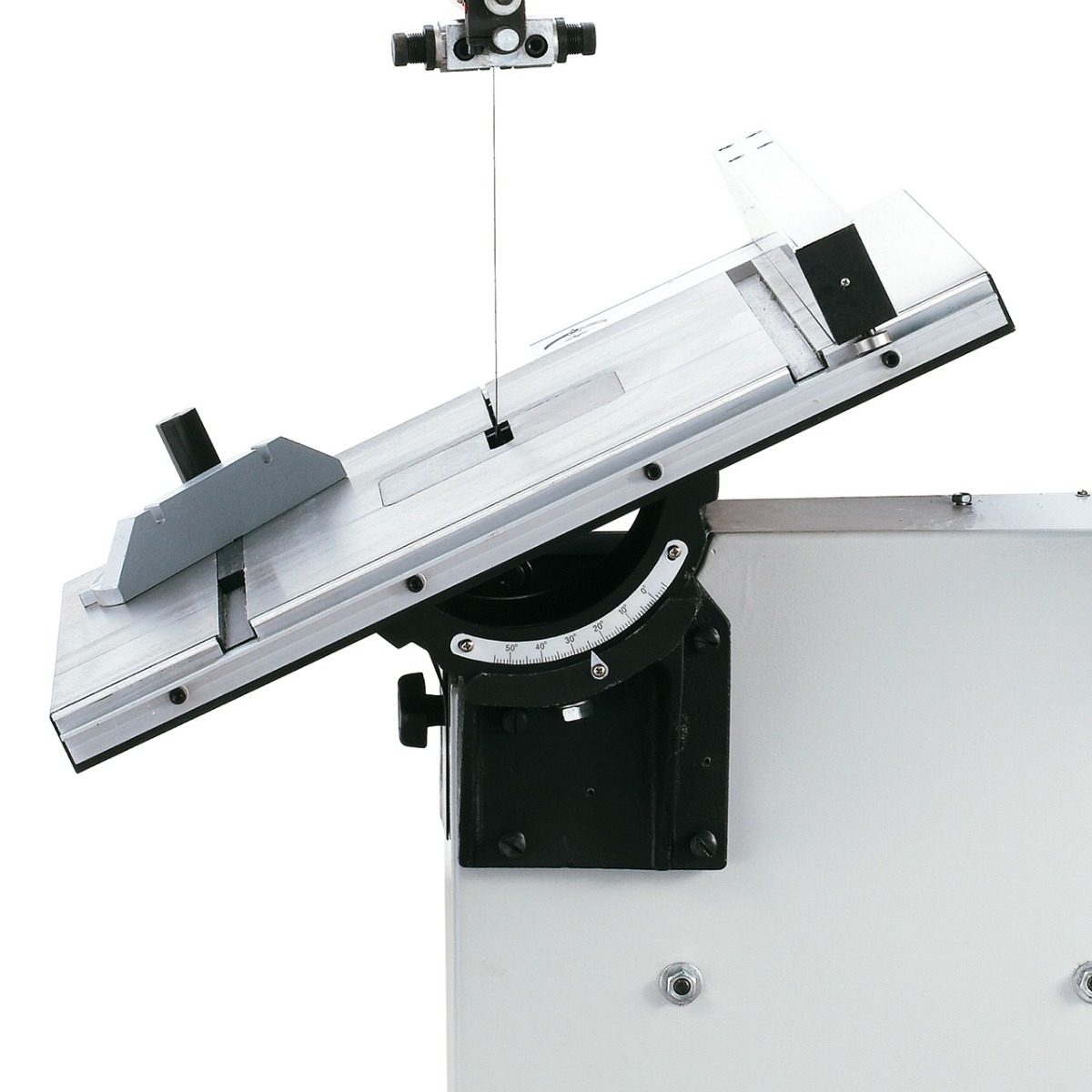 • Schwenkbarer Arbeitstisch für Winkelschnitte von 0° bis 45°
