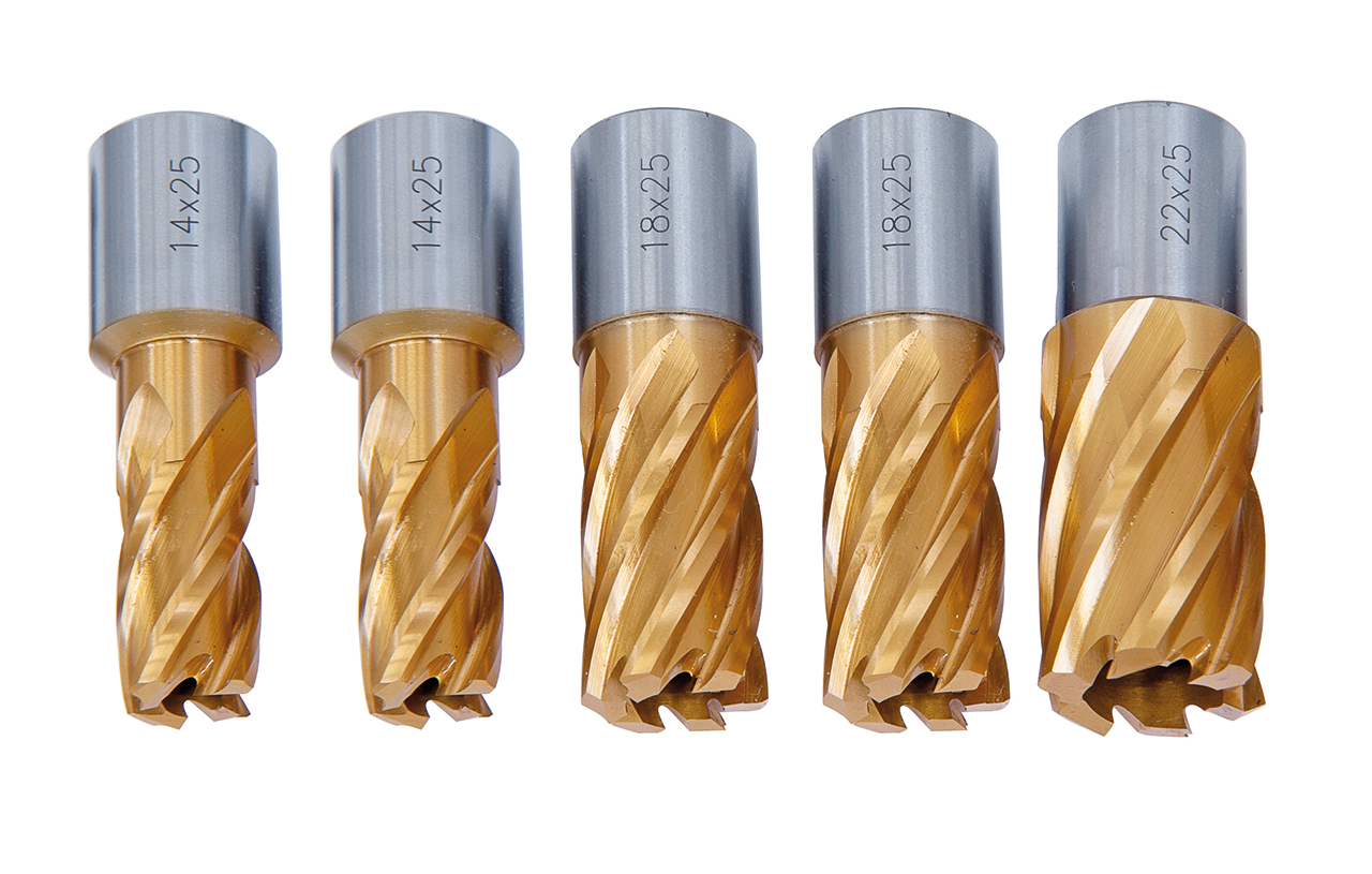 Die TiN- und nACO-beschichteten Kernbohrer CDS und CDL sind aus Hochleistungsschnellstahl gefertigt und für den professionellen Einsatz konzipiert. Die Sets beinhalten die meistgebrauchten Größen und sind wahlweise mit einer Bohrtiefe von 25 und 50 mm (TiN-beschichtet) bzw. 30 mm und 50 mm (nACO-beschichtet) erhältlich. Vorteil der Kernbohrer gegenüber den Spiralbohrern ist, dass nicht die gesamte Bohrfläche, sondern nur ein schmaler Ring zerspant wird. Dadurch ist der Kraftaufwand wesentlich geringer.