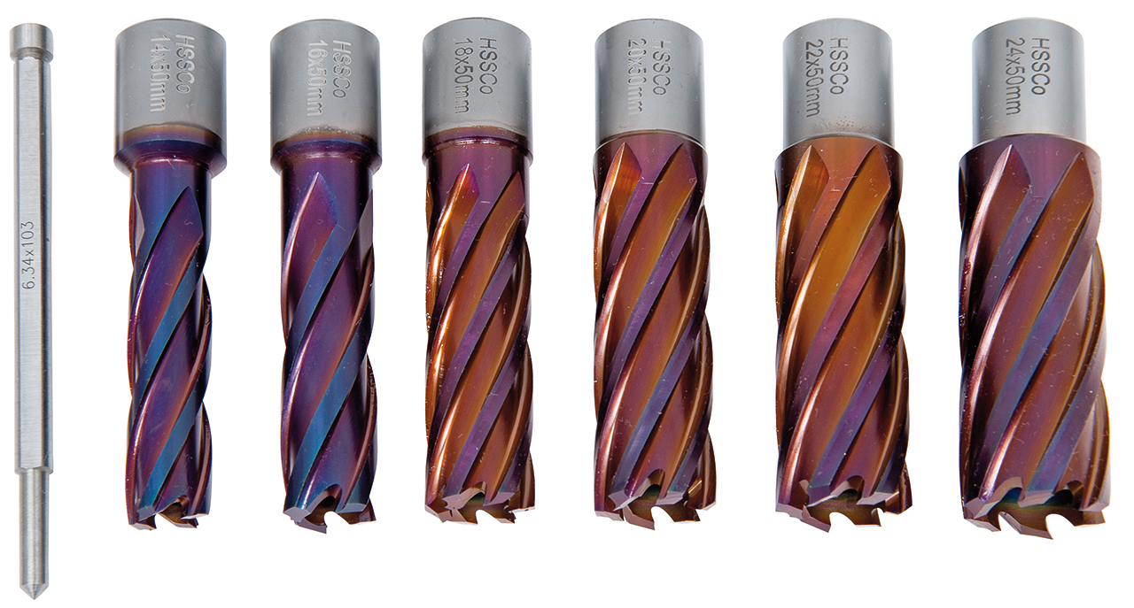 Die TiN- und nACO-beschichteten Kernbohrer CDS und CDL sind aus Hochleistungsschnellstahl gefertigt und für den professionellen Einsatz konzipiert. Die Sets beinhalten die meistgebrauchten Größen und sind wahlweise mit einer Bohrtiefe von 25 und 50 mm (TiN-beschichtet) bzw. 30 mm und 50 mm (nACO-beschichtet) erhältlich. Vorteil der Kernbohrer gegenüber den Spiralbohrern ist, dass nicht die gesamte Bohrfläche, sondern nur ein schmaler Ring zerspant wird. Dadurch ist der Kraftaufwand wesentlich geringer.