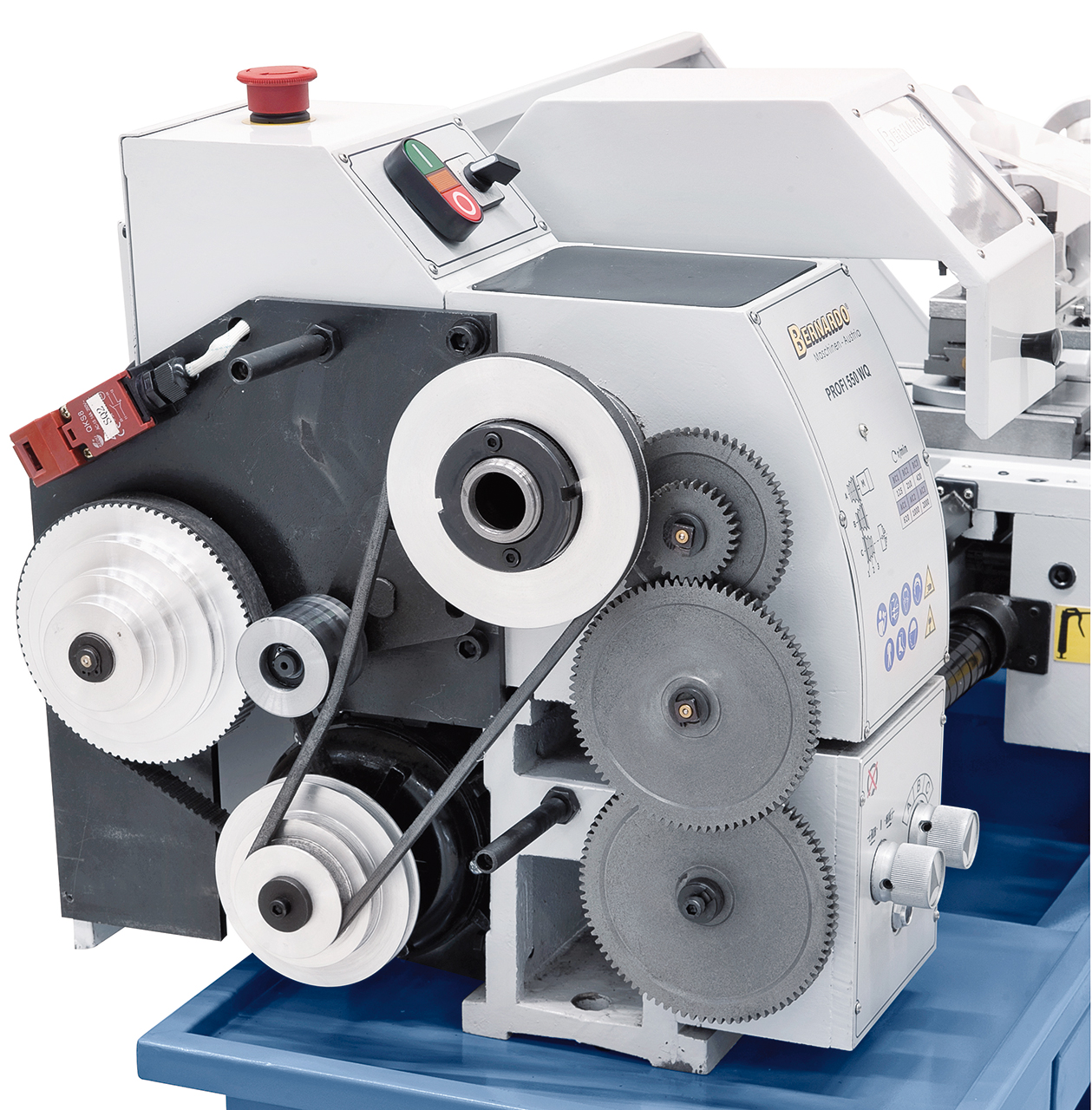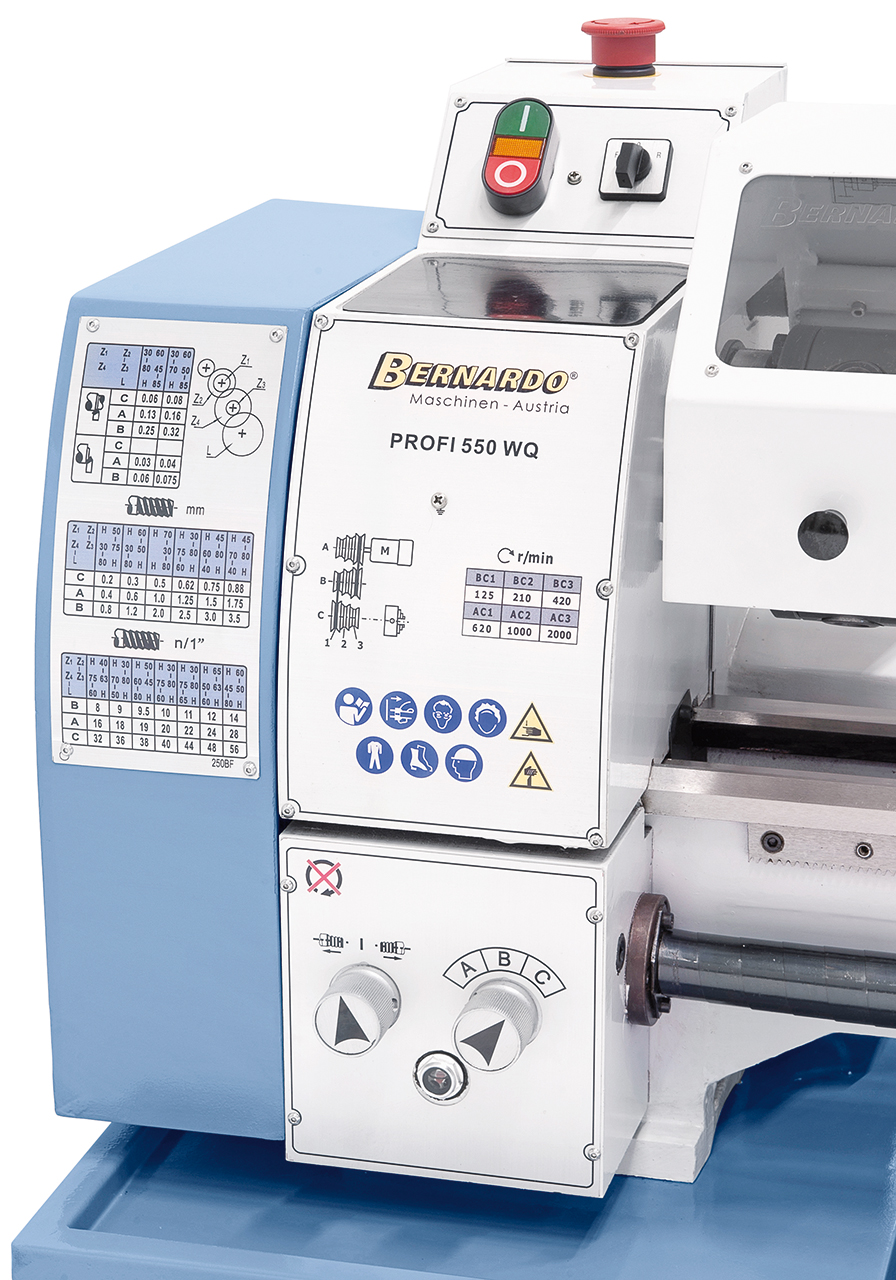 Die präzise Leitspindeldrehmaschine Profi 550 WQ wird nach den strengen Vorgaben des DIN-Standards gefertigt. Die Besonderheit dieses Modells ist der große Längsvorschubbereich mit 6 frei wählbaren Vorschüben sowie der serienmäßige Planvorschub.