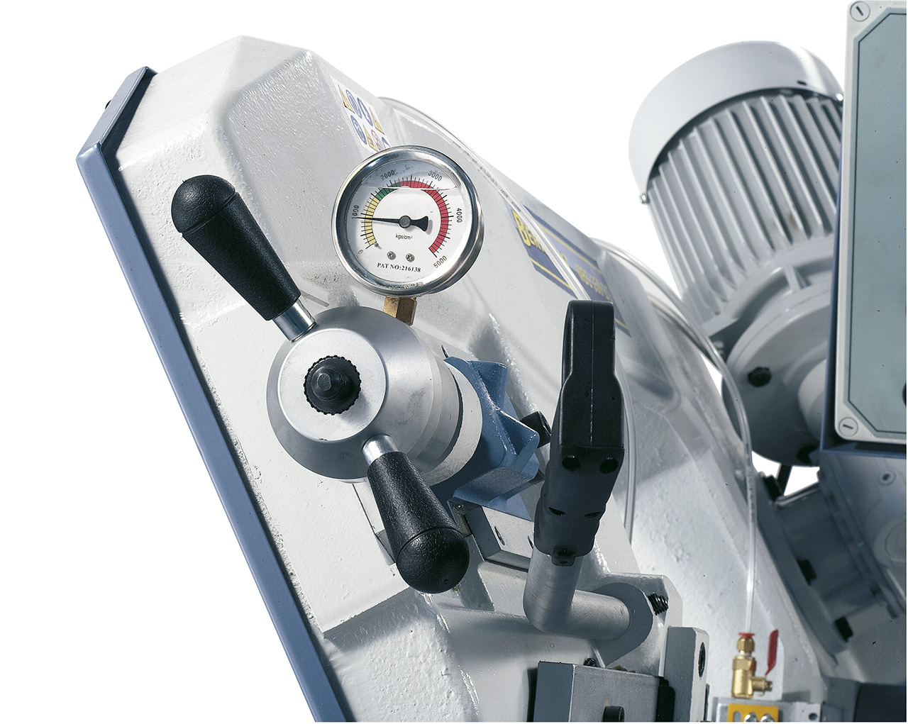 - Einstellbarer Hydraulikzylinder zur Auflagedruckregulierung des Sägebügels