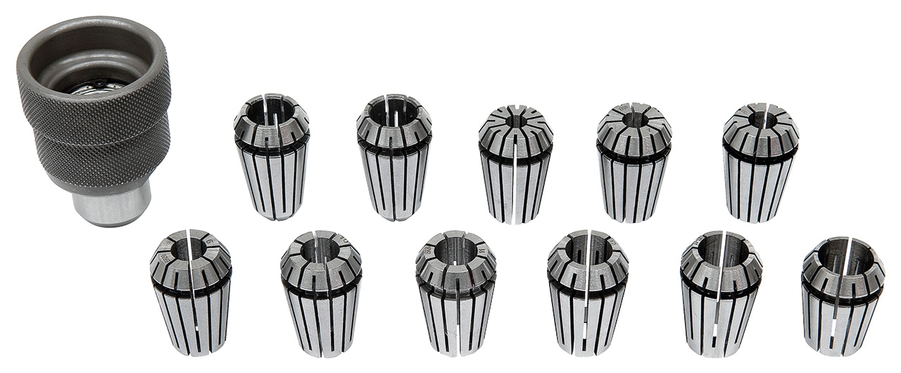- 11 Stk. ER 20 Spannzangen im Lieferumfang enthalten, welche auch zum Spannen von Zwischengrößen geeignet sind