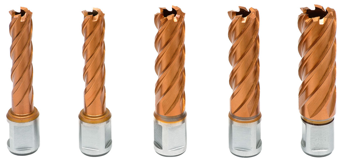 Die Kernbohrer HSS-Vario PLUS sind auch Hochleistungsschnellstahl gefertigt und gewährleisten durch die Hartstoffbeschichtung eine längere Lebensdauer. Weitere Vorteile der Hartstoffbeschichtung sind eine verbesserte Spanableitung, höhere Verschleißfestigkeit sowie hohe Wirtschaftlichkeit. Vorteil der Kernbohrer gegenu?ber den Spiralbohrern ist, dass nicht die gesamte Bohrfläche, sondern nur ein schmaler Ring zerspant wird. Dadurch ist der Kraftaufwand wesentlich geringer.