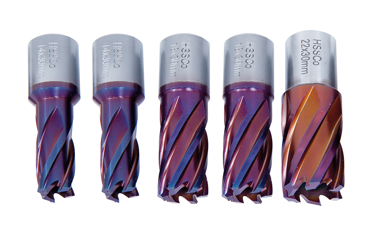 Die TiN- und nACO-beschichteten Kernbohrer CDS und CDL sind aus Hochleistungsschnellstahl gefertigt und für den professionellen Einsatz konzipiert. Die Sets beinhalten die meistgebrauchten Größen und sind wahlweise mit einer Bohrtiefe von 25 und 50 mm (TiN-beschichtet) bzw. 30 mm und 50 mm (nACO-beschichtet) erhältlich. Vorteil der Kernbohrer gegenüber den Spiralbohrern ist, dass nicht die gesamte Bohrfläche, sondern nur ein schmaler Ring zerspant wird. Dadurch ist der Kraftaufwand wesentlich geringer.