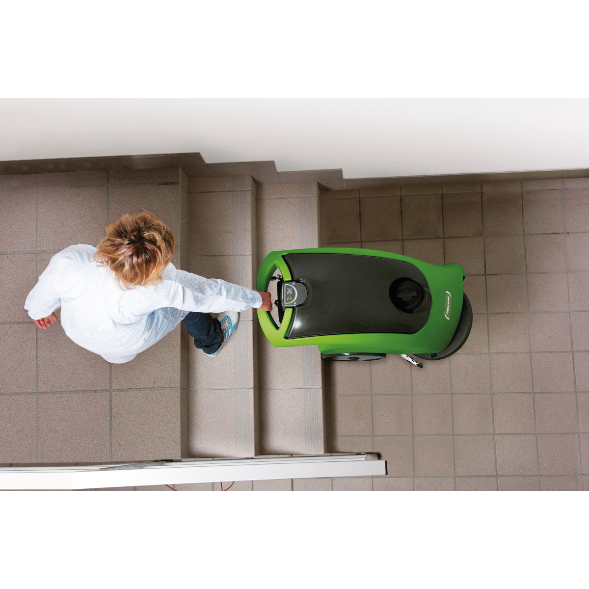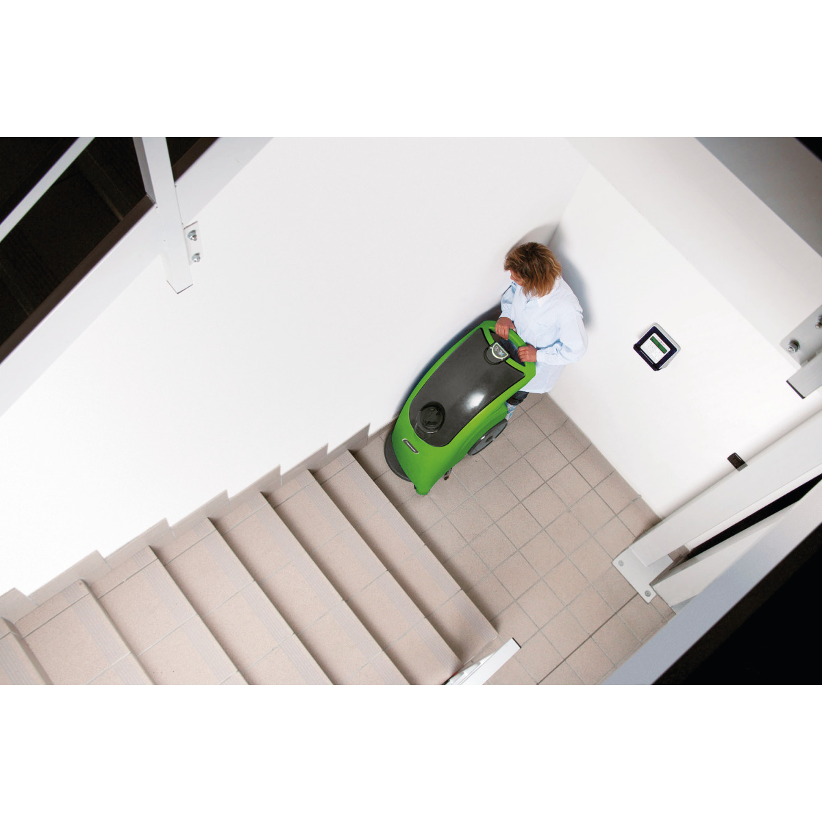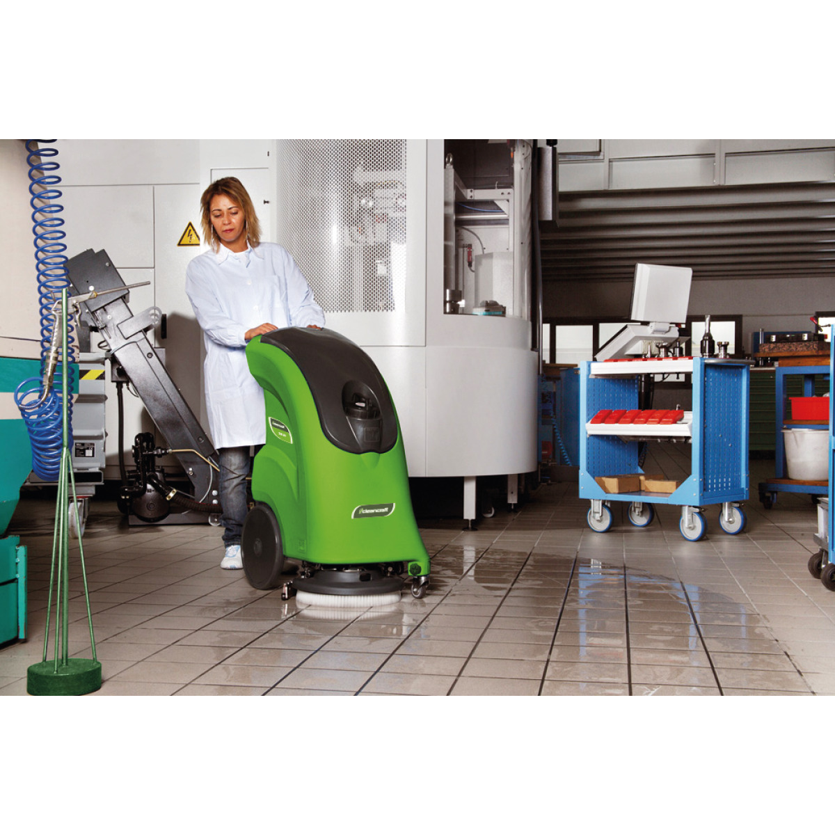 Kompakte und handliche Scheuersaugmaschine mit 41 cm Arbeitsbreite und halb-automatischem Antrieb – das ideale Gerät für die Reinigung kleiner, verstellter Räume