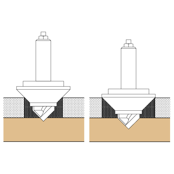 entriegelt. Wird der Schlitz in der Schablone breiter, kann der Fräser tiefer eintauchen und produziert eine tiefere und breitere V-Nut. Wird der Schlitz schmaler, taucht der Fräser weniger tief ein, die V-Nut wird schmaler und flacher.
