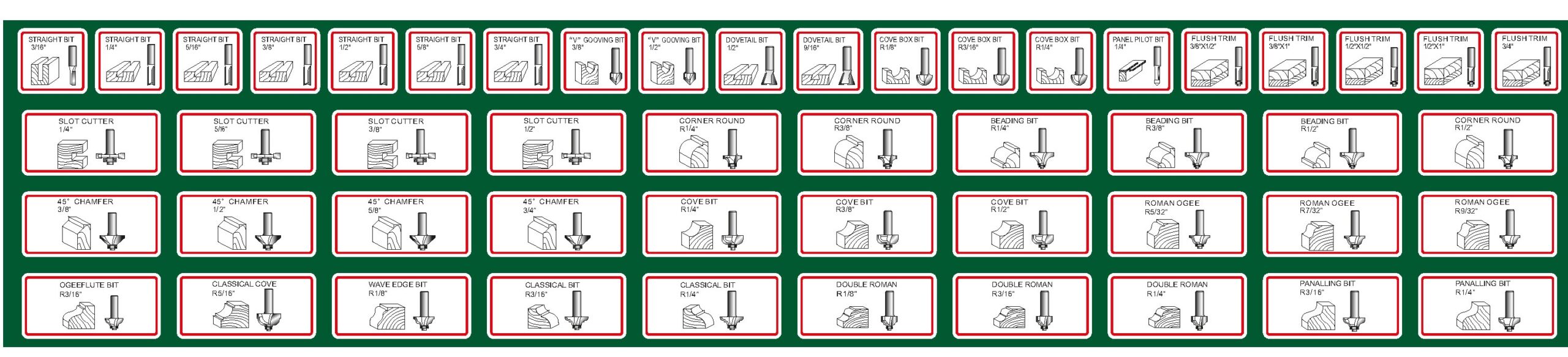 Lieferumfang: 7x Nutfräser (3/16", 1/4", 5/16", 3/8", 1/2", 5/8", 3/4"), 2x V-Nutfräser (3/8", 1/2"), 2x Zinkenfräser (1/2", 9/16"), 3x Hohlkehlfräser (R1/8", R3/16", R1/4"), 1x Panel Pilotfräser (1/4"), 5x Bündigfräser (3/8"x1/2", 3/8"x1", 1/2"x1/2", 1/2"x1", 3/4"), 4x Scheibennutfräser (1/4", 5/16", 3/8", 1/2"), 3x Abrundfräser (R1/4", R3/8", R1/2"), 3x Rundprofilfräser R(1/4", R3/8", R1/2"), 4x Fasenfräser 45° (3/8", 1/2", 5/8", 3/4"), 3x Hohlkehlfräser mit Kugellager (R1/4", R3/8", R1/2"), 3x Römerprofilfräser (R5/32", R7/32", R9/32"), 3x Doppel-Römerprofilfräser (R1/8", R3/16", R1/4"), 7x Profilfräser (R3/16", R5/16", R1/8", R3/16", R1/4", R3/16", R1/4")