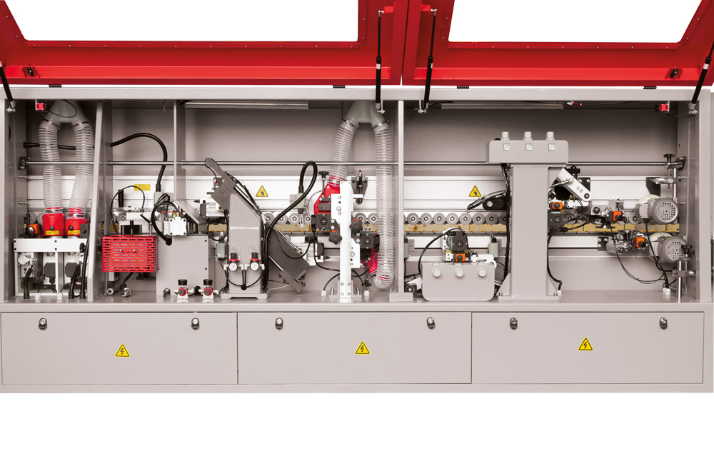 - Kantentrimm (Doppelfräsaggregat) eines für die untere und eines für die obere Kantenecke des Werkstücks (0,3kW Motor pro Einheit )