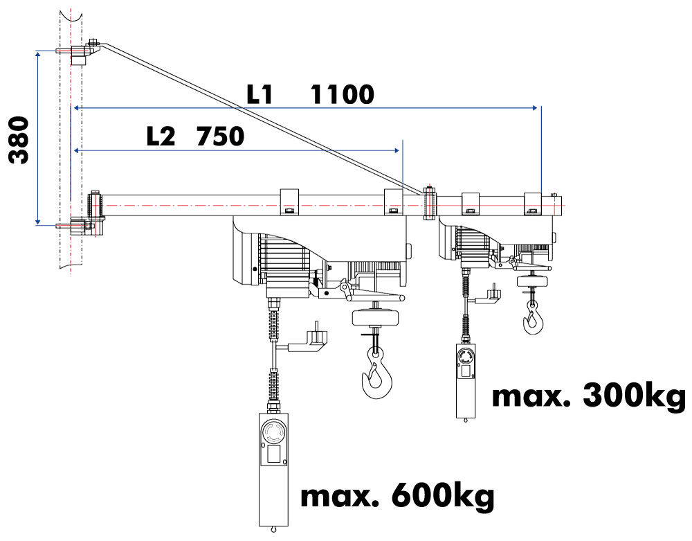 • SA3001100: Ausladung 750/1100 mm, max. 600/300 kg (L2/L1)
