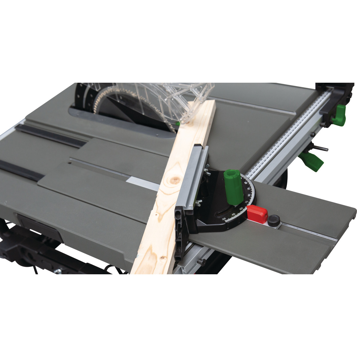 - Integrierter Schiebeschlitten mit Gehrungsanschlag und 45° Neigung des Sägeblattes möglich
