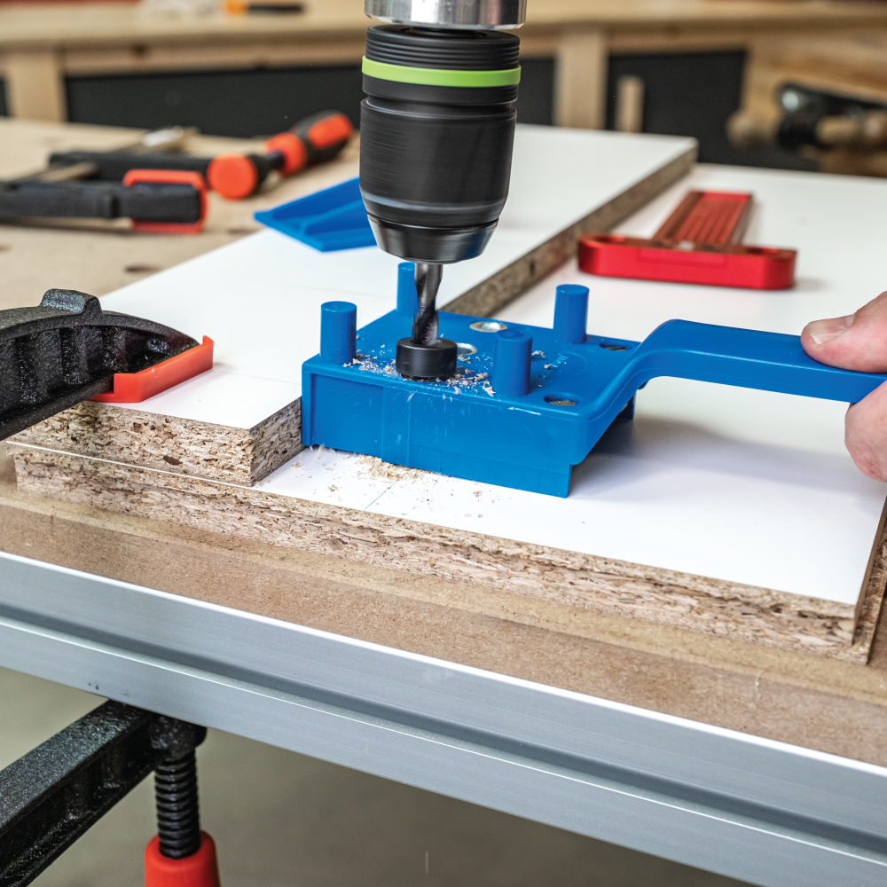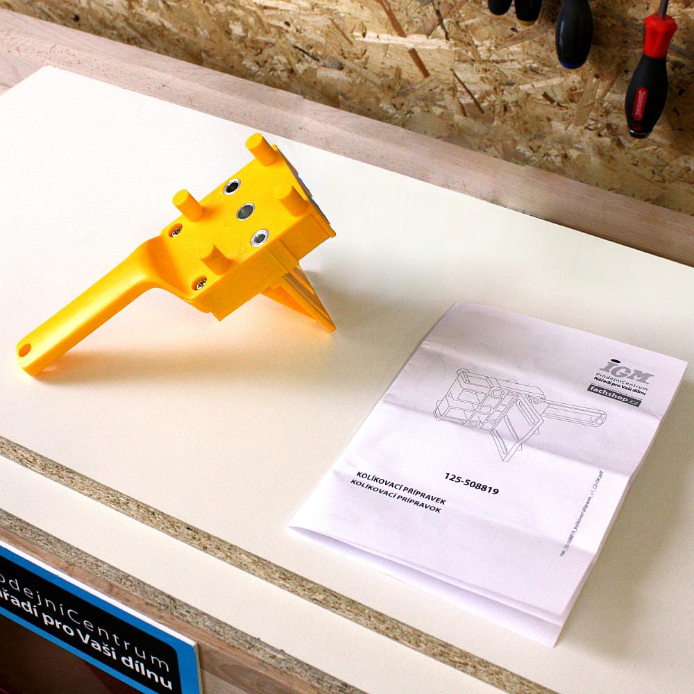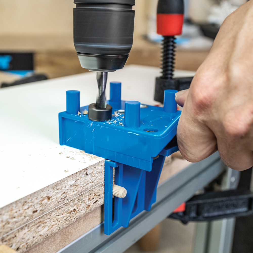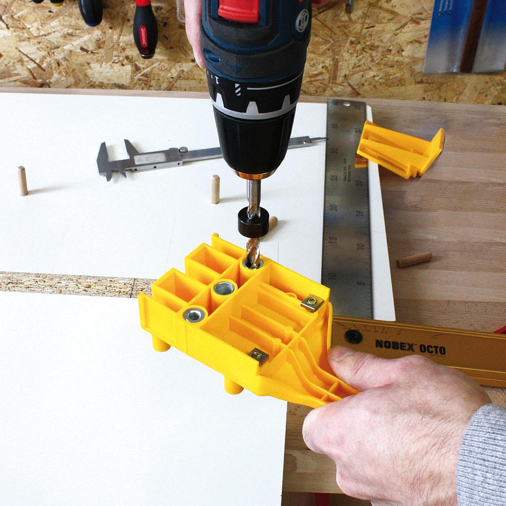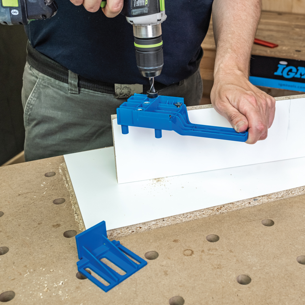 Die die IGM Basis-Bohrlehre ist aufgrund ihrer einfachen Handhabung vor allem für Heimwerker gedacht. Mit der Schablone können Sie E-, L- und T-Verbindungen mit 6-, 8- oder 10mm Runddübeln anfertigen. Die Zentrierdorne der Vorrichtung zentrieren das Loch auf einem bis zu 30 mm dicken Werkstück. Der Griff der Bohrlehre ermöglicht eine einfache Handhabung und ein einfaches Halten beim Bohren. Die Bohrlehre wird am Werkstück gehalten, ein Bohrer wird in die gehärtete Stahlbüchse der Bohrhilfe gesetzt und Sie können das gewünschte Loch in das Werkstück bohren. Sie können einen Satz Markierungsspitzen und einen Tiefenanschlag am Bohrer verwenden, um die Arbeit zu erleichtern. Einer der Vorteile gegenüber anderen Bohrvorrichtungen ist, dass Sie sich um die Zentrierung des Lochs nicht mehr kümmern müssen.