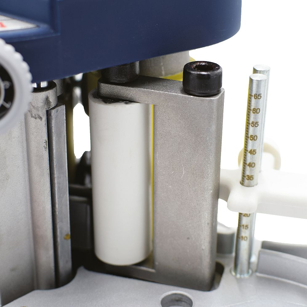 • Massive Konstruktion des verschiebbaren Auflagetisches mit Plattendickenskala.