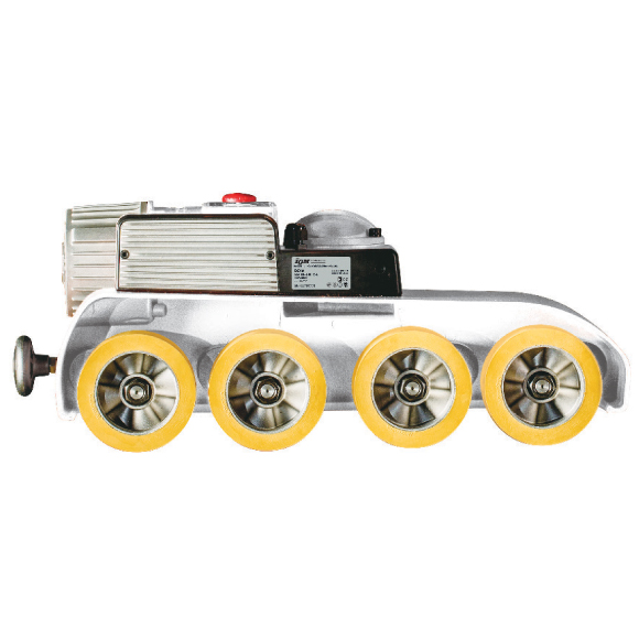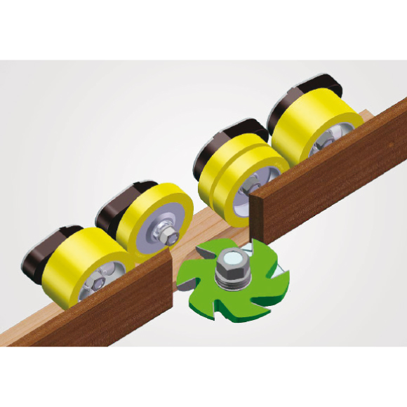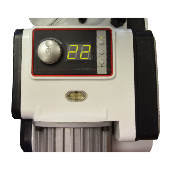 Der Vorschub ist mit modernsten DC-Servomotoren mit einer Leistungsaufnahme von 400 W mit stufenloser Vorschubregelung ausgestattet. Es spart mehr als 50 % der Stromkosten bei gleichbleibendem Drehmoment, insbesondere bei niedrigeren Drehzahlen im Vergleich zu ähnlichen Feedergrößen mit einem herkömmlichen 750-W-Motor. Es wartet kein Demontieren der Abdeckung und das Auswechseln von Zahnrädern mehr auf Sie. Sie wählen einfach die gewünschte Geschwindigkeit am digitalen Regler im Bereich von 2–22 m/min. Perfekt gefederte Rollen mit einem Durchmesser von 120 mm und einer Breite von 60 mm haben eine hervorragende Griffigkeit und meistern Unebenheiten perfekt. Wenn Sie näher an das Werkzeug herankommen möchten, kann die Standardrolle durch eine spezielle schmale Rolle mit 25 mm Breite ersetzt werden, die auf Anfrage erhältlich ist.