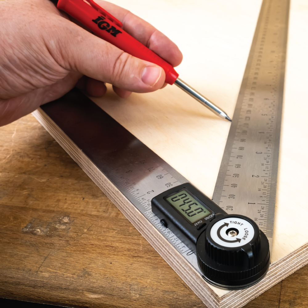 Der digitale Winkelmesser von IGM ist ein zuverlässiges Messgerät, das für jeden Handwerker von Nutzen ist. Damit lassen sich der Gehrungswinkel präzise einstellen, gerade Linien zeichnen und Winkel von Werkstück zu Werkstück exakt übertragen. Mittels zweier intuitiver Tasten lassen sich sämtliche relevanten Funktionen bedienen, einschließlich der Nullstellung in jeder Position. Das Gerät ist dank Display-Einschaltautomatik bei Schenkelbewegung jederzeit einsatzbereit. Für Tischler, Zimmerleute und andere Handwerker sowie Heimwerker geeignet. Für Arbeiten an längeren Werkstücken sowie exakte Anreiß- und Messvorgänge auch bei längeren Abschnitten bestens geeignet.