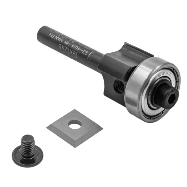 Fräser zum präzisen Passungsfräsen und Schablonenkantenabtastung nach der darunter liegenden Schablone. Bei einem herkömmlichen Lötfräser wird beim Schärfen der Schnittdurchmesser gegenüber dem Kugellager reduziert, wodurch sich ein Zahn bildet. Der Wendeplatten-Fräser eliminiert dieses Phänomen mit präzise ausgerichteten, austauschbaren Wendeplatten, die auch gedreht und bis zu 4 Schneiden verwendet werden können. Für das Fräsen von Corian kann auch ein gerades oder konisches Kugellager mit einem Kunststoffring nachgekauft werden, um eine präzise Führung durch das Material zu gewährleisten.
