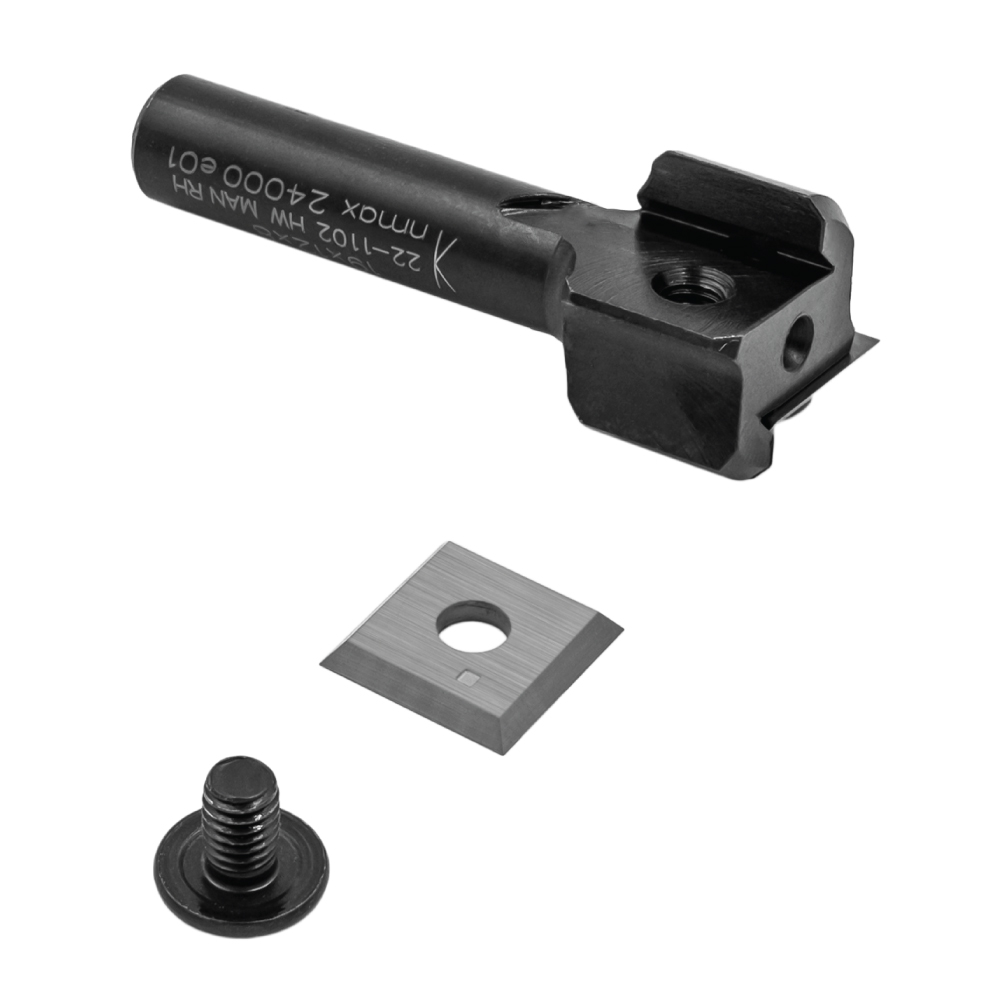 Fräser zum präzisen Passungsfräsen und Schablonenkantenabtastung nach der darunter liegenden Schablone. Bei einem herkömmlichen Lötfräser wird beim Schärfen der Schnittdurchmesser gegenüber dem Kugellager reduziert, wodurch sich ein Zahn bildet. Der Wendeplatten-Fräser eliminiert dieses Phänomen mit präzise ausgerichteten, austauschbaren Wendeplatten, die auch gedreht und bis zu 4 Schneiden verwendet werden können. Für das Fräsen von Corian kann auch ein gerades oder konisches Kugellager mit einem Kunststoffring nachgekauft werden, um eine präzise Führung durch das Material zu gewährleisten.