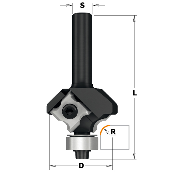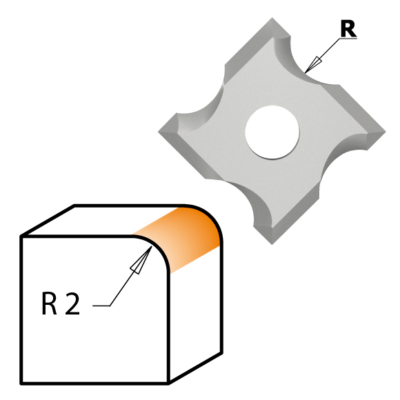Abrundfräser ausgestattet mit zwei Hartmetallmessern zum Abrunden der Kanten. Der Radius wird auf allen 4 Seiten der Wendeplatte für maximale Werkzeugeffizienz geschliffen. Der Fräser ist mit einer Wendeplatte mit einem Radius von R3mm oder R2mm ausgestattet, die hauptsächlich für ABS-Kanten verwendet wird. Es ist auch möglich, einen Radius von R1 mm und R1,5 mm mit dem Fräser zu erwerben, mit dem Sie die Kante beim Verkleben von Umakart, Furnier oder Schichtstoff auf Platten anfasen können. Für den Einsatz auf Handoberfräsen.