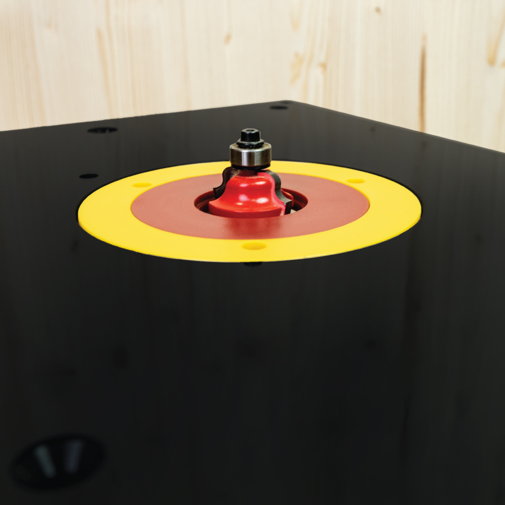 Die Frästisch-Zentriereinlegeplatte ist ohne Bohrungen zur Befestigung der Oberfräse und ist aus 6 mm starken Glattkunstoff in schwarz hergestellt. Sie ist mit 4 Nivellierschrauben zur exakten Einstellung im Frästisch ausgestattet. Geliefert mit 2 abnehmbaren Reduzierringen zum Einspannen verschiedener Größen von Schaftfräsern mit einem Durchmesser von 30 mm bis 66 mm.