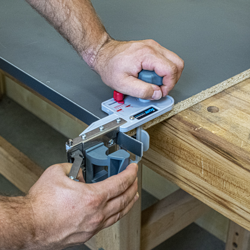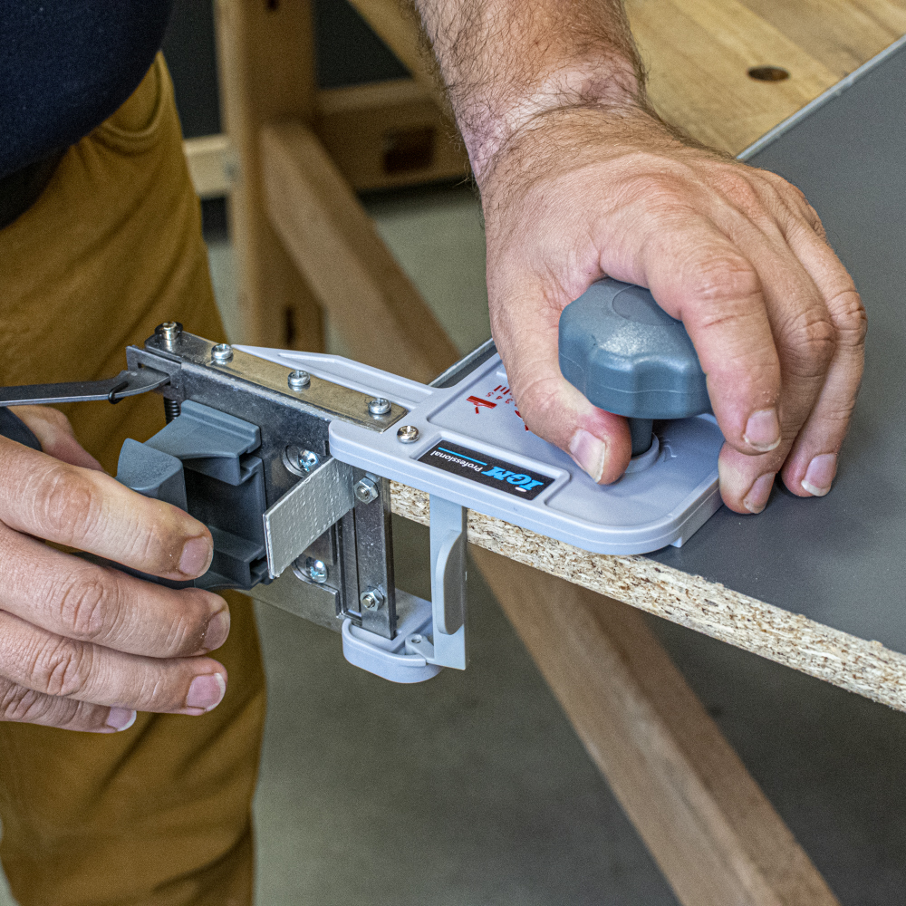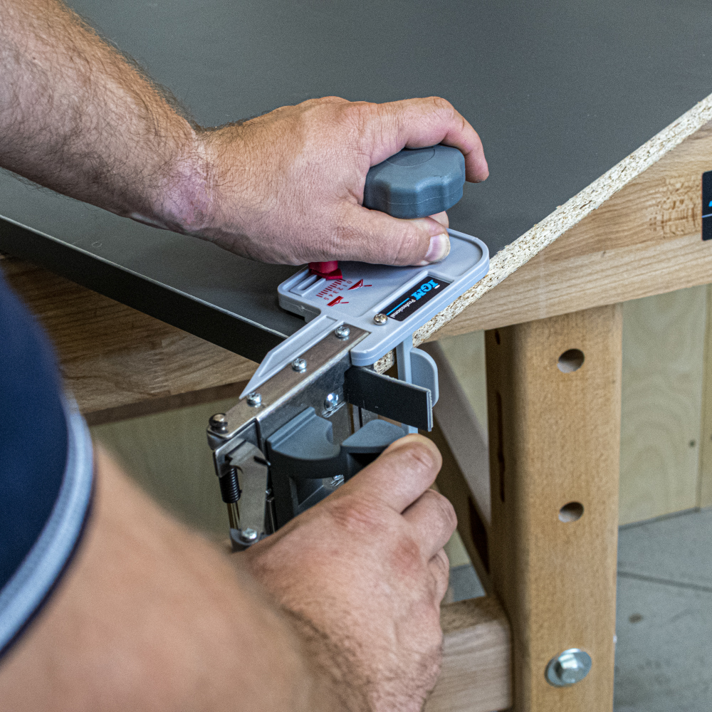 Entwickelt für präzises und sauberes Schneiden von ABS-, Melamin-, Polyester- oder Furnierkanten. Je nach Kantenhärte ist es möglich, Kanten bis zu einer Breite von 55 mm zu kürzen. 2 mm dicke Kanten bis zu 45 mm Breite und 3 mm dicke Kanten bis zu 25 mm Breite. Das Guillotine-System ermöglicht es Ihnen, die Kante ohne großen Aufwand zu beschneiden. Die Kante wird durch die Guillotine geführt und abgeschnitten. Schneidemesser können nachgeschärft werden. Die Schnittposition kann genau eingestellt werden, was ein präzises Gehrungsschneiden bis zu 60° ermöglicht.