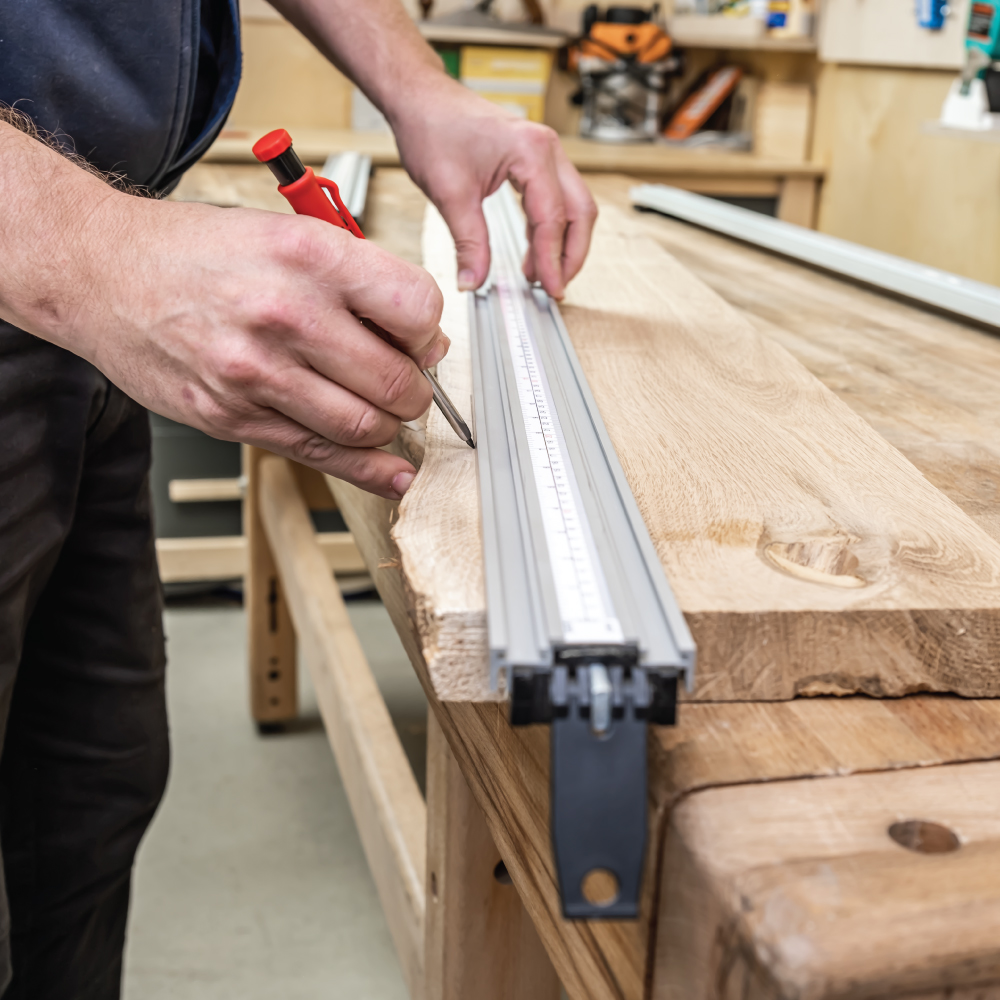 Zahlreiche Verwendungsmöglichkeiten. Kann als Unterstützung für Präzisionsschnitte mit der Kreissäge, zum Fräsen mit der Oberfräse oder zum Anreißen verwendet werden. Verwendung auch als Hilfsanschlag auf Bohrmaschine oder einem Frästisch. Kann auch als klassische Klemme verwendet werden, um das Material beim Verkleben zusammenzuhalten. Die Backen können das Werkstück über die gesamte Länge der Klemmschiene festhalten, allerdings mit weniger Kraftaufwand als bei herkömmlichen Tischlerzwingen.