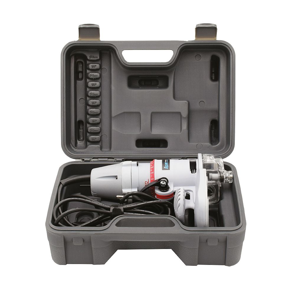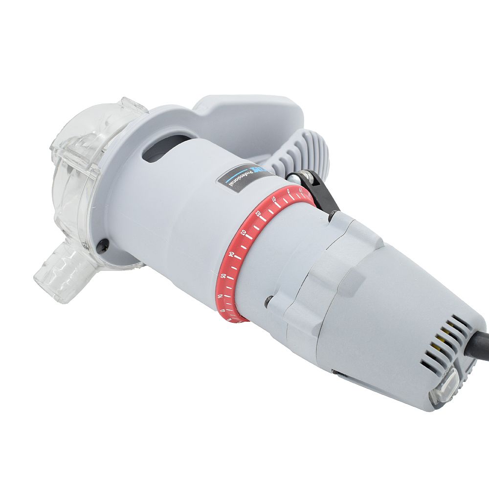 Das einzigartige Design der Fräse bietet dank der Führungsbasis mit Griff eine hervorragende Stabilität. Der Motor hat 30.000 U/min und bietet ausreichend Leistung für größere Materialabträge. Das Gerät ist mit einer einzigartigen transparenten drehbaren Abdeckung ausgestattet, die die Oberfläche kopiert und dank der Sie die Arbeit immer perfekt sehen können. Der integrierte Absaugadapter ermöglicht den Anschluss der Fräse an die Absaugung. Die Lagerbremse befindet sich im unteren Teil des Deckels. Dadurch wird ein Verkratzen oder Wegdrücken des Werkstücks durch das drehende Lager verhindert. Die genaue Tiefe lässt sich einfach durch Drehen der Grundplatte einstellen, wobei 1 Umdrehung 2 mm entspricht und die genaue Einstellung auf einer Nonius-Skala mit einer Auflösung von 0,05 mm abgelesen werden kann.