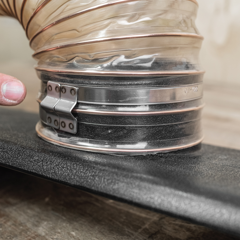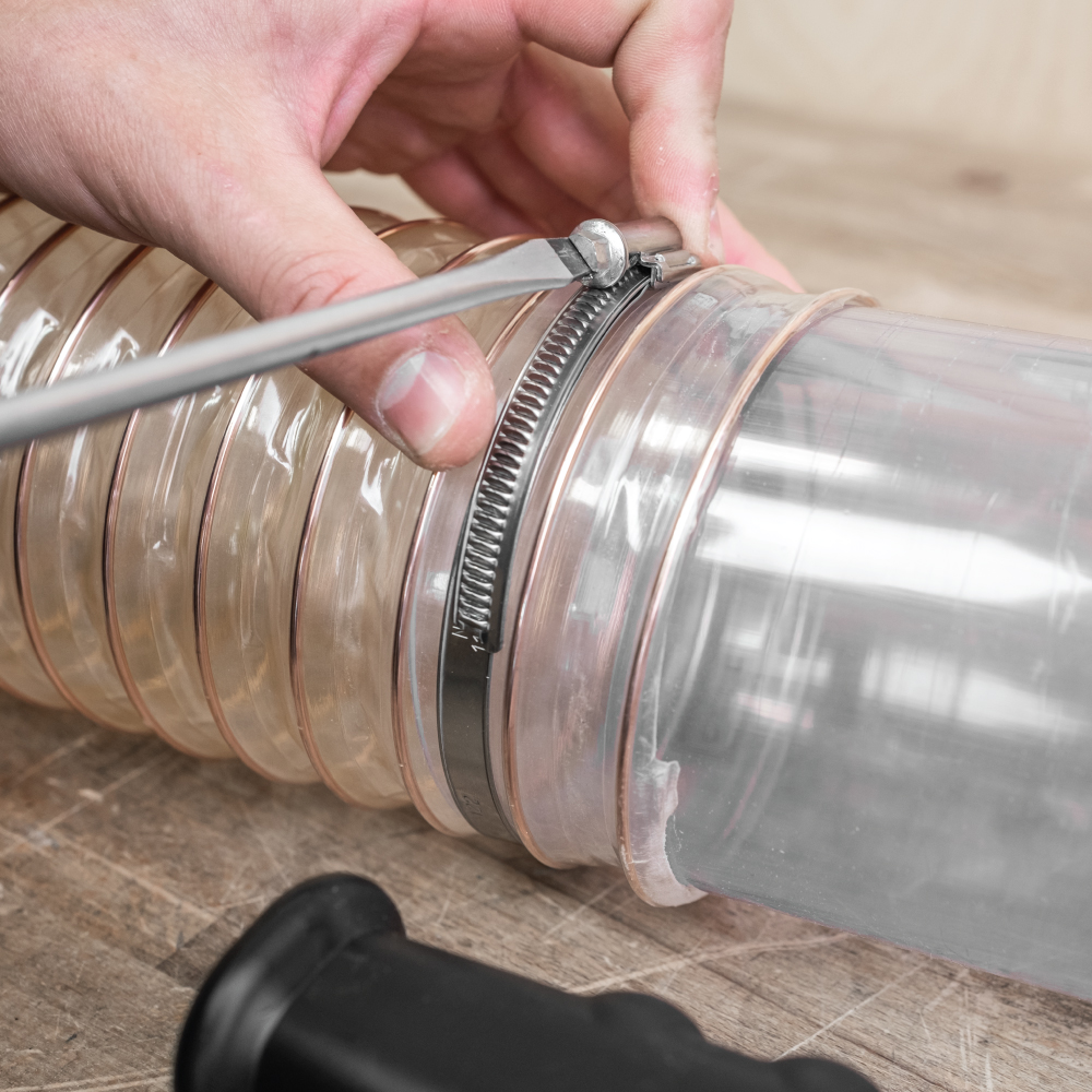 Spezielle Schlauchbefestigungsschelle mit doppelter Brücke für 100 mm Absaugschläuche. Garantiert einen starken Druck auch bei den anspruchsvollsten Anwendungen. Die Kanten der Schelle sind abgerundet, um eine Beschädigung des Schlauches zu vermeiden. Hergestellt aus rostfreiem Stahl.