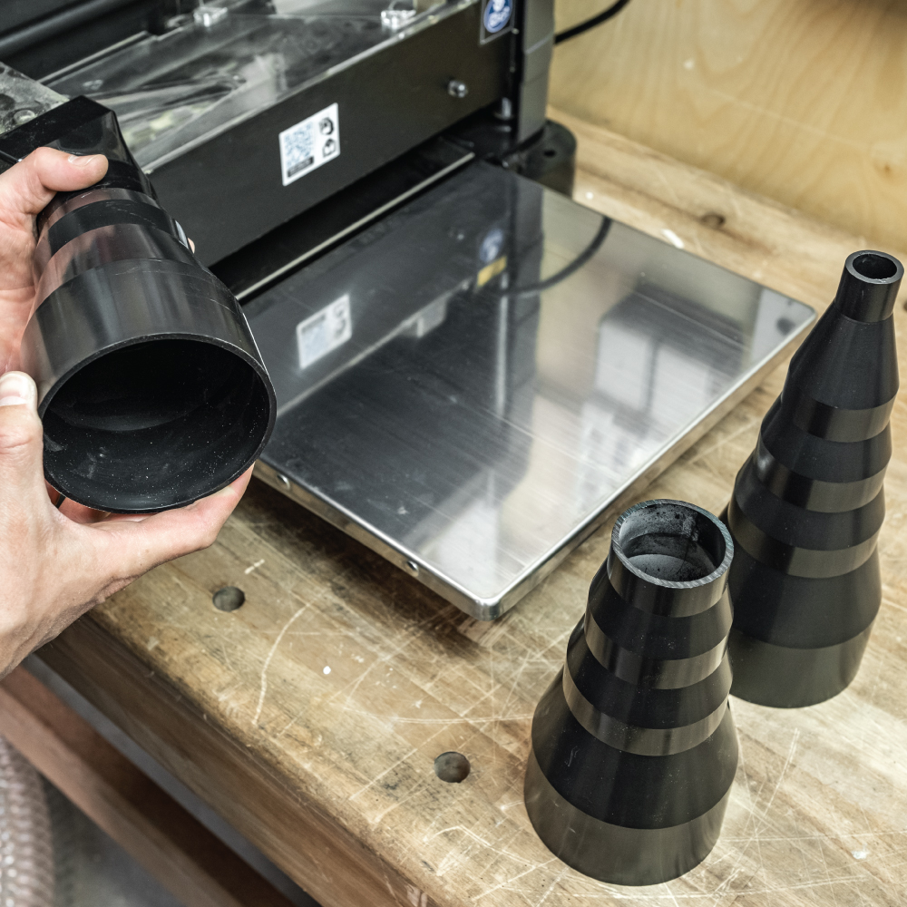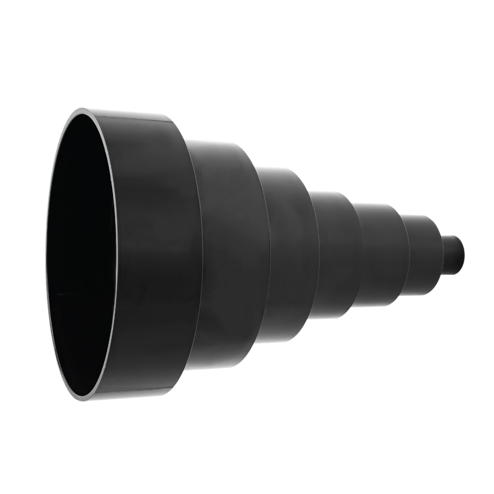 Dank seiner sieben verschiedenen Größen ist der mehrfach abgestufte Schlauchadapter ideal für den Anschluss verschiedener Geräte oder Elektrowerkzeuge, die sonst schwierig an eine Absauganlage anzuschließen sind. Sie schneiden einfach den gewünschten Abschnitt ab. Zum Ausschneiden benötigen Sie eine feinzahnige Säge. Die Durchmesser sind 25, 50, 63, 75, 100, 125 und 150 mm (die Größenangaben beziehen sich auf den Außendurchmesser).