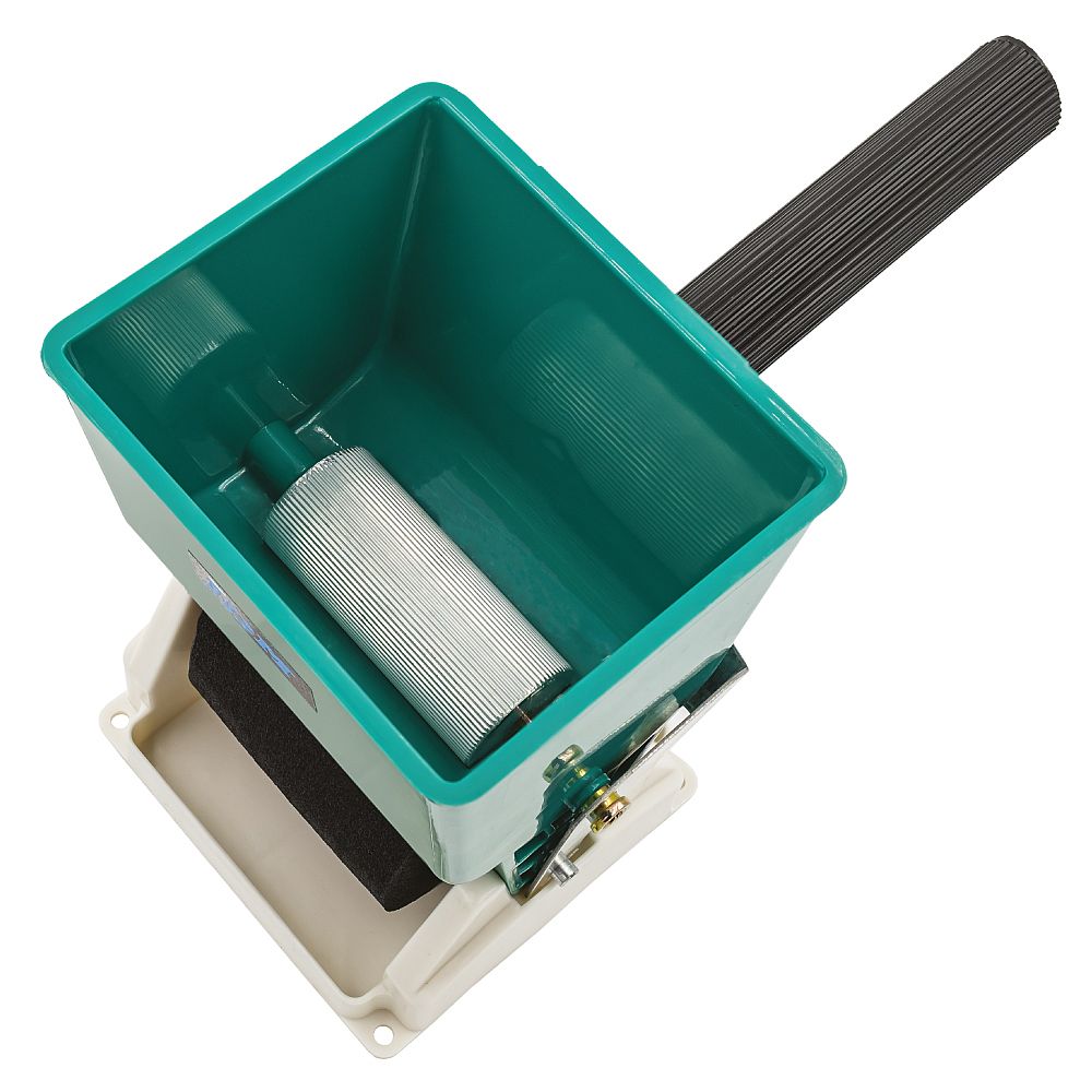 Verwendung: Ersatzwalze aus dem Behälter herausnehmen. Den Griff an den Behälter einschrauben. Dispersionsklebstoff in den Behälter gießen.