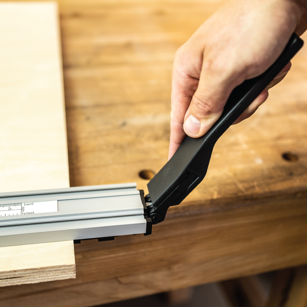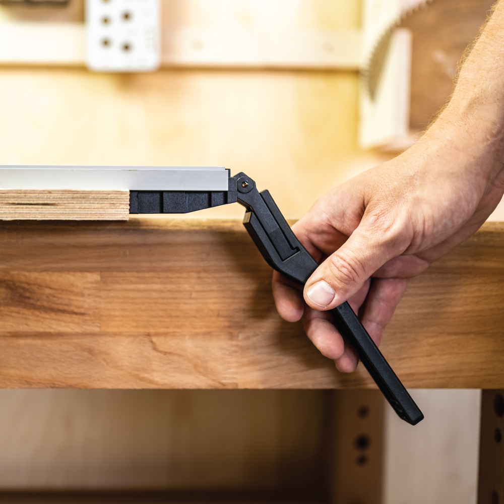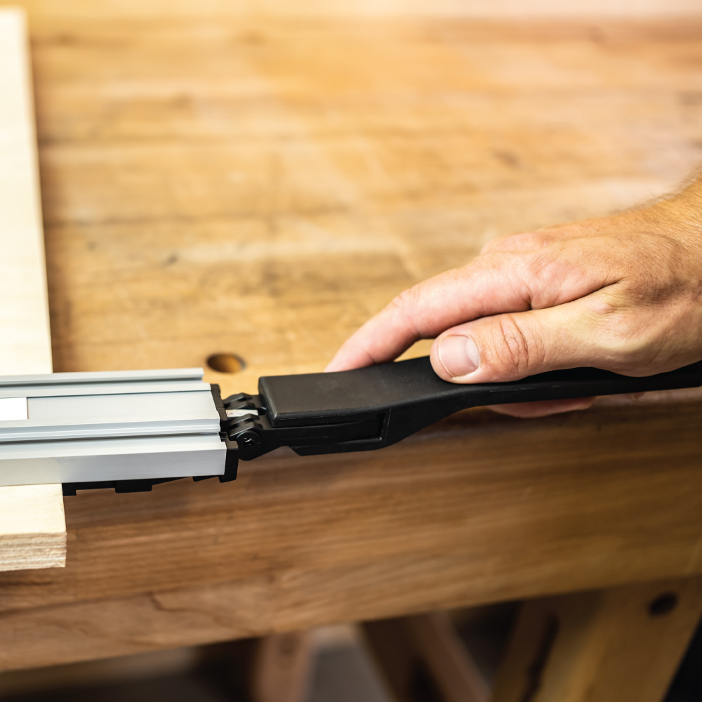 Der verlängerte Griff kann für alle Längen von Schnellspann-Führungsschienen verwendet werden. Verbessert und erleichtert die Arbeit. Das Spannen und Lösen der Klemme ist dank des längeren Griffs leichter und einfacher.