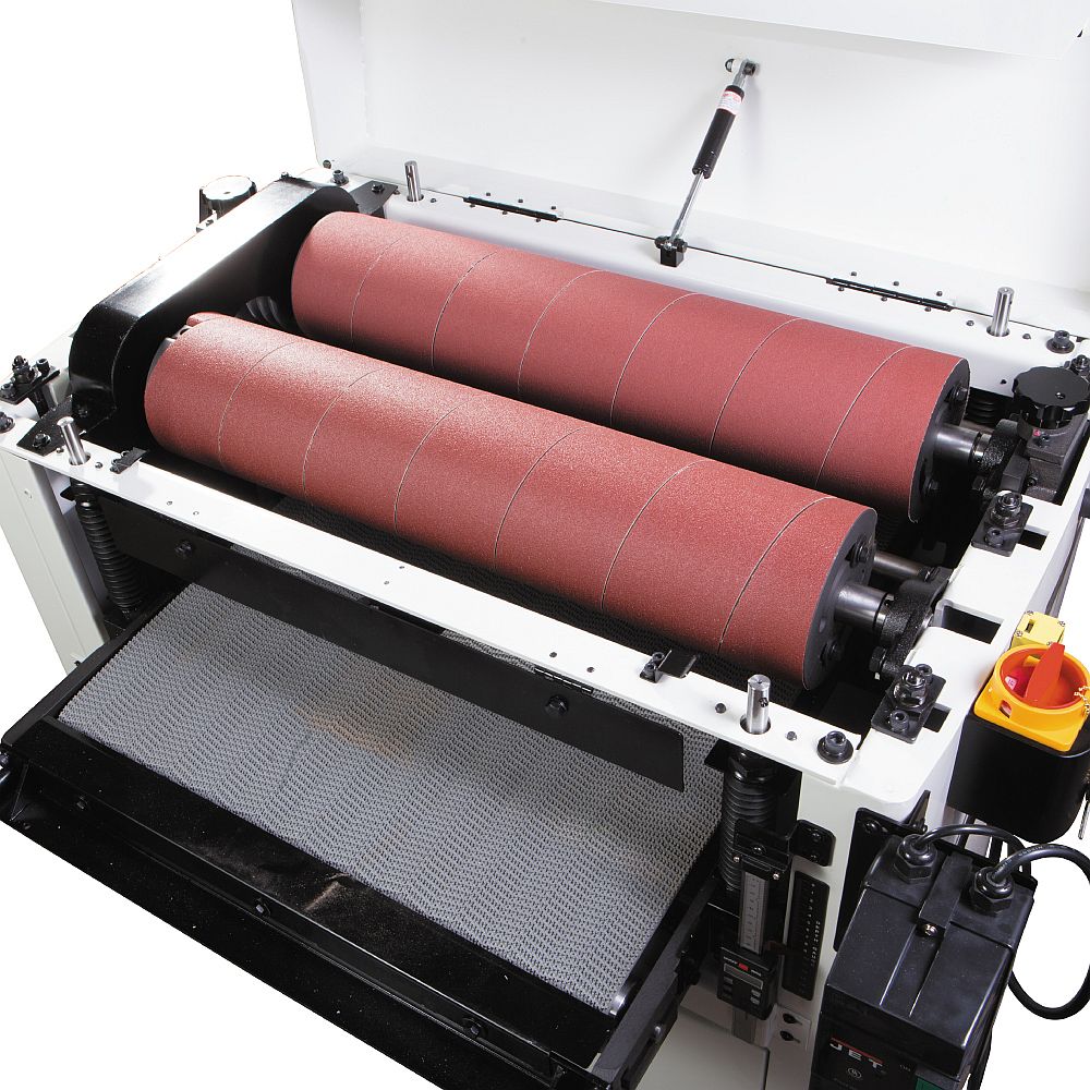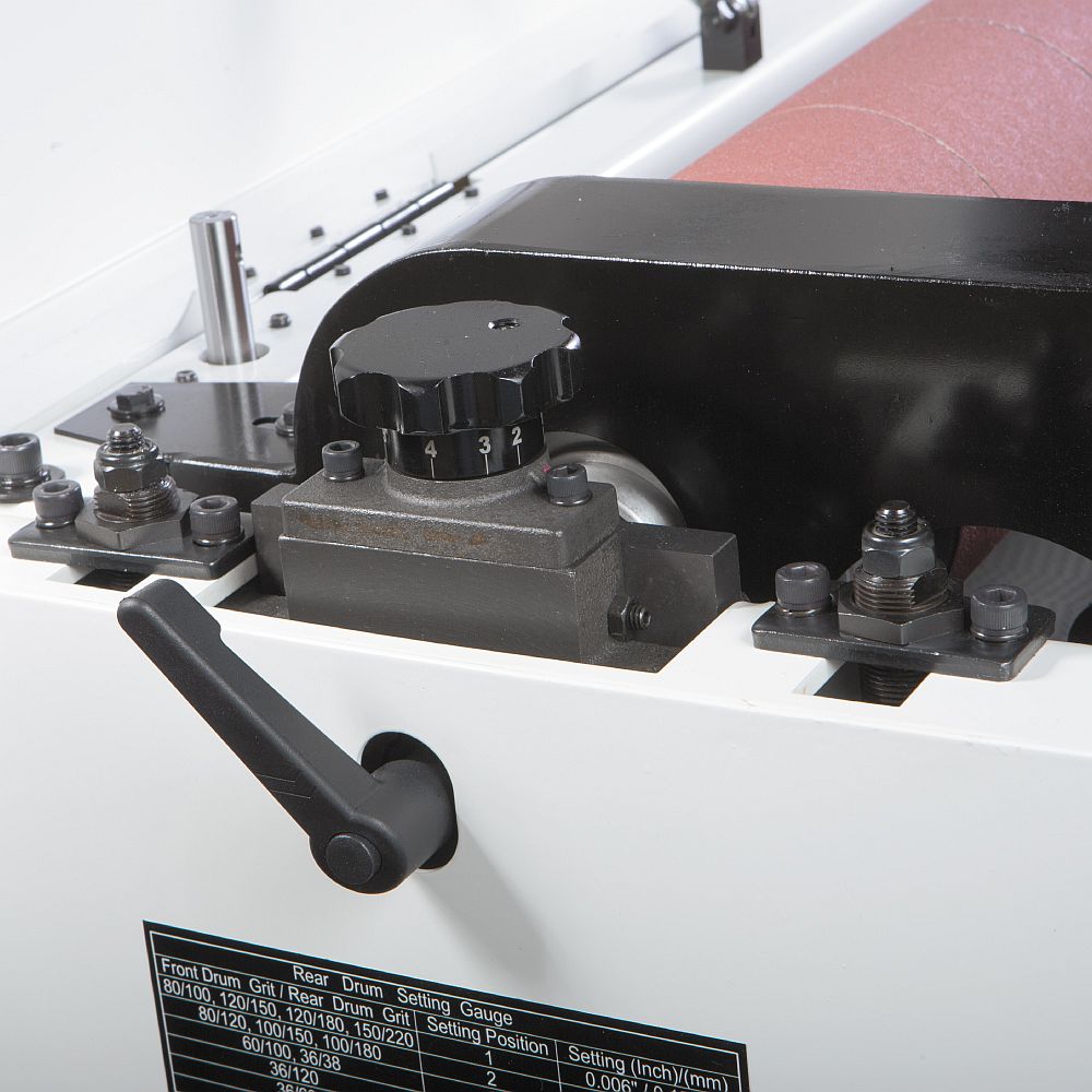 Die Doppelzylinder-Schleifmaschine hat eine starke und feste Stahlkonstruktion und einen leistungsstarken Motor. Die beiden 152mm Schleifwalzen sind aus präzisionsgefertigtem Duraluminiumguss gefertigt, perfekt ausgewuchtet und gummiert. Sie ermöglichen finale Oberflächenbearbeitung in einem Durchgang. Die vordere Trommel ist mit einem groben Schleifmittel für effektive Materialabnahme ausgestattet, während die hintere Trommel mit einer Spanabnahme versehen ist, mit der Sie eine andere Höhe als auf der vorderen Trommel einstellen können, was ein feines Finish ermöglicht. Das Schleifband mit 75 mm oder 100 mm Breite ist spiralförmig auf die Schleifwalze gewickelt und verfügt über clevere Spannkeile, die einen schnellen und einfachen Wechsel des Schleifmittels ermöglichen.