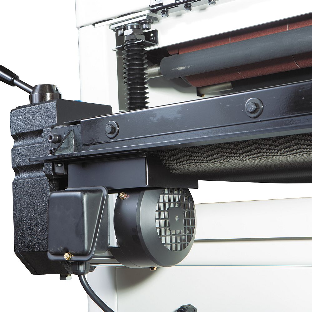 Gummierte Walzen sorgen für eine gute Fixierung des Schleifbandes. Das Transportband ist aus Gummi-Textil-Material und wird von einem autonomen Motor mit einem zweistufigen Vorschubgetriebe und einem intelligenten System mit zwei Vorschubgeschwindigkeiten für perfektes Schleifen von verschiedenen Arten von Werkstücken angetrieben. Das Werkstück wird durch drei Andruckrollen auf das Transportband gedrückt, die eine gleichmäßige Schleifstärke bei gleichzeitiger Arbeitssicherheit gewährleisten. Die robuste Konstruktion, der leistungsstarke Motor, die zwei Schleifwalzen und die Vorschubgeschwindigkeiten von 2 und 3 m/Min tragen dazu bei, in einem einzigen Durchgang fast 1,5 mm von einem Werkstück mit einer Dicke von 0,8 mm bis 133 mm abzuschleifen. Beide Geschwindigkeiten ermöglichen eine Nivellierung des Werkstücks mit einer Genauigkeit von bis 0,2 mm über die ganze Schleifbreite. Die genaue Einstellung der Spanabnahme erfolgt über ein manuelles Bedienrad mit einer digitalen Skala, um die Genauigkeit zu erhöhen.