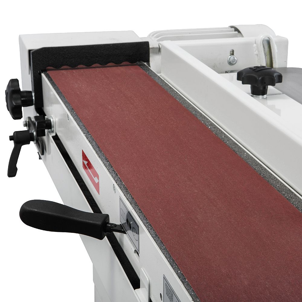 Oszillierende Kantenschleifmaschine zum Schleifen von Kanten und Radien. Die Schleifmaschine ermöglicht das stufenlose Neigen des Schleifbandes, das Schleifen in horizontaler oder vertikaler Position. Das Schleifband oszilliert mit 50 Oszillationen/min, ohne die Oberfläche des Materials zu zerkratzen. Der massive Graugusstisch lässt sich leicht nach oben oder unten verschieben, so dass das Schleifband in der gesamten Breite genutzt werden kann. Die angetriebene Walze ist gummiert, was eine maximale Kraftübertragung auf das Schleifband gewährleistet. Spannung und Oszillation können leicht eingestellt werden. Der Sockel der Maschine ist stabil und aus Stahl gefertigt, was die Stabilität erhöht und Vibrationen minimiert. Die Schleifmaschine hat einen großen Unterschrank zur Aufbewahrung der Schleifbänder. Sie ist für Werkstätten, Wartungsarbeiten und Heimwerker geeignet.