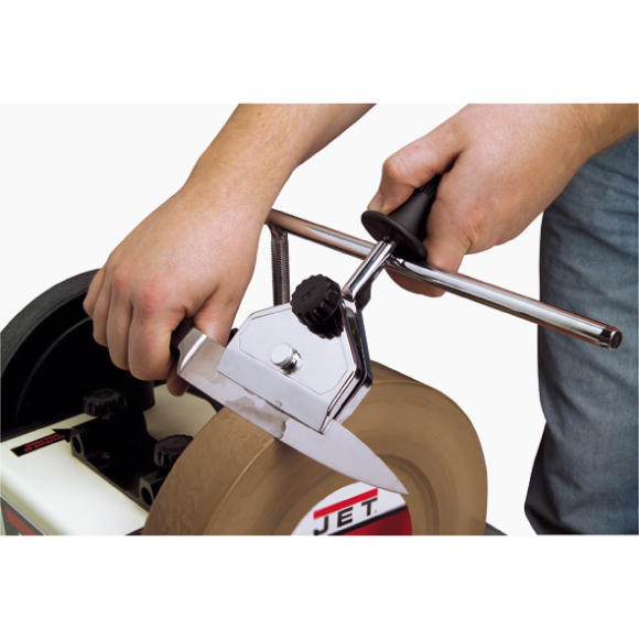 Die breite Spannfläche sichert das Einspannen von langen Messern auch bei abgerundeten Messern. Die Feineinstellung des Schleifwinkels erfolgt über einen Drehgriff. Nachdem Sie die gesamte Schneidkante geschliffen haben, drehen Sie die Vorrichtung um und schleifen die gegenüberliegende Seite des Messers im gleichen Winkel.