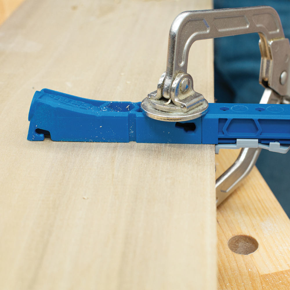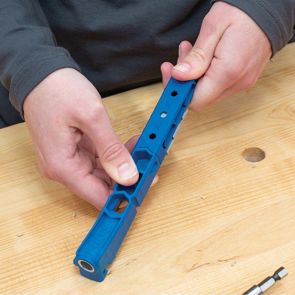 Eine Materialstärkenanzeige und ein Bohrer mit leicht einstellbarem Anschlag erleichtern die Arbeit, während eine rutschfeste Unterlage das Werkzeug sicher an Ort und Stelle hält. Dadurch bohren Sie jedes Mal perfekt positionierte verdeckte Fugen. Robuste Konstruktion und Gehäuse sorgen für eine lange Lebensdauer.