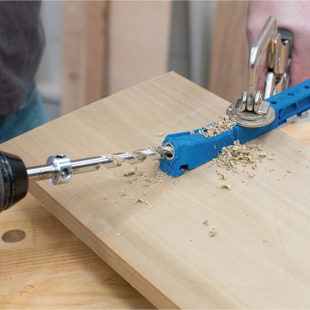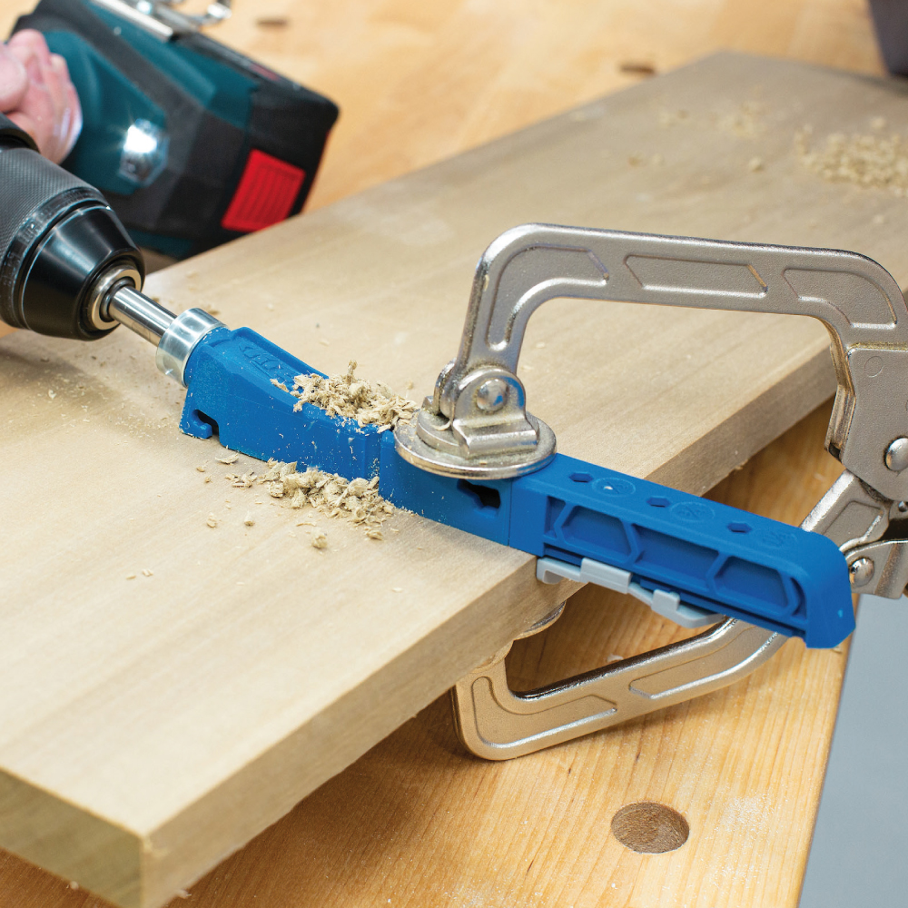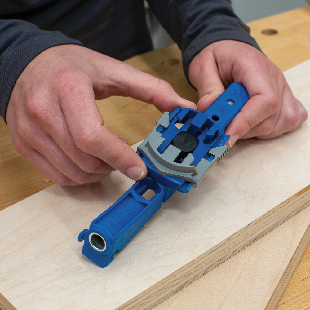 Die Kreg Pocket-Hole Jig 310 wird mit einem gehärteten Stahlbohrer und einem einstellbaren Anschlag für 13 mm, 19 mm und 38 mm Dicke geliefert.