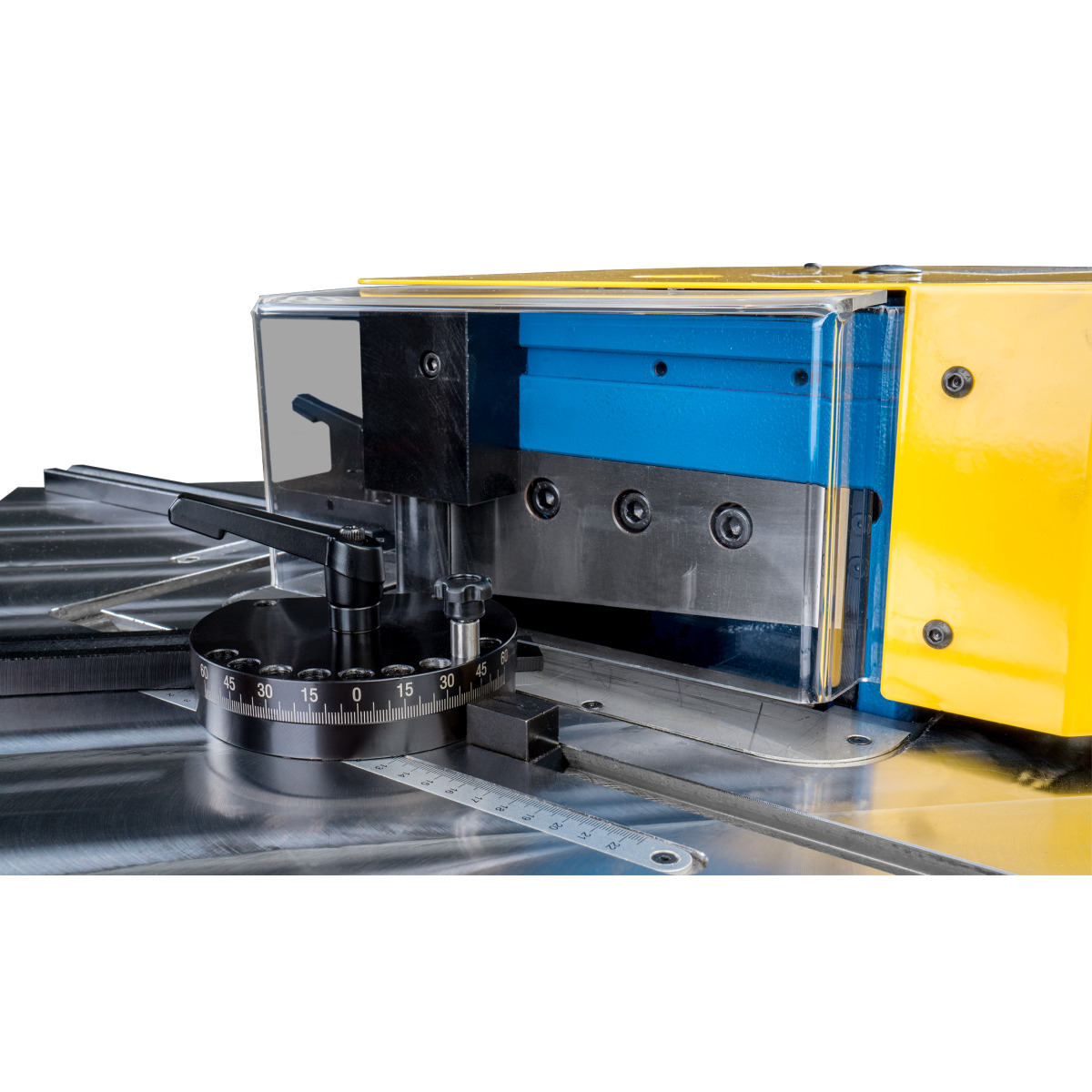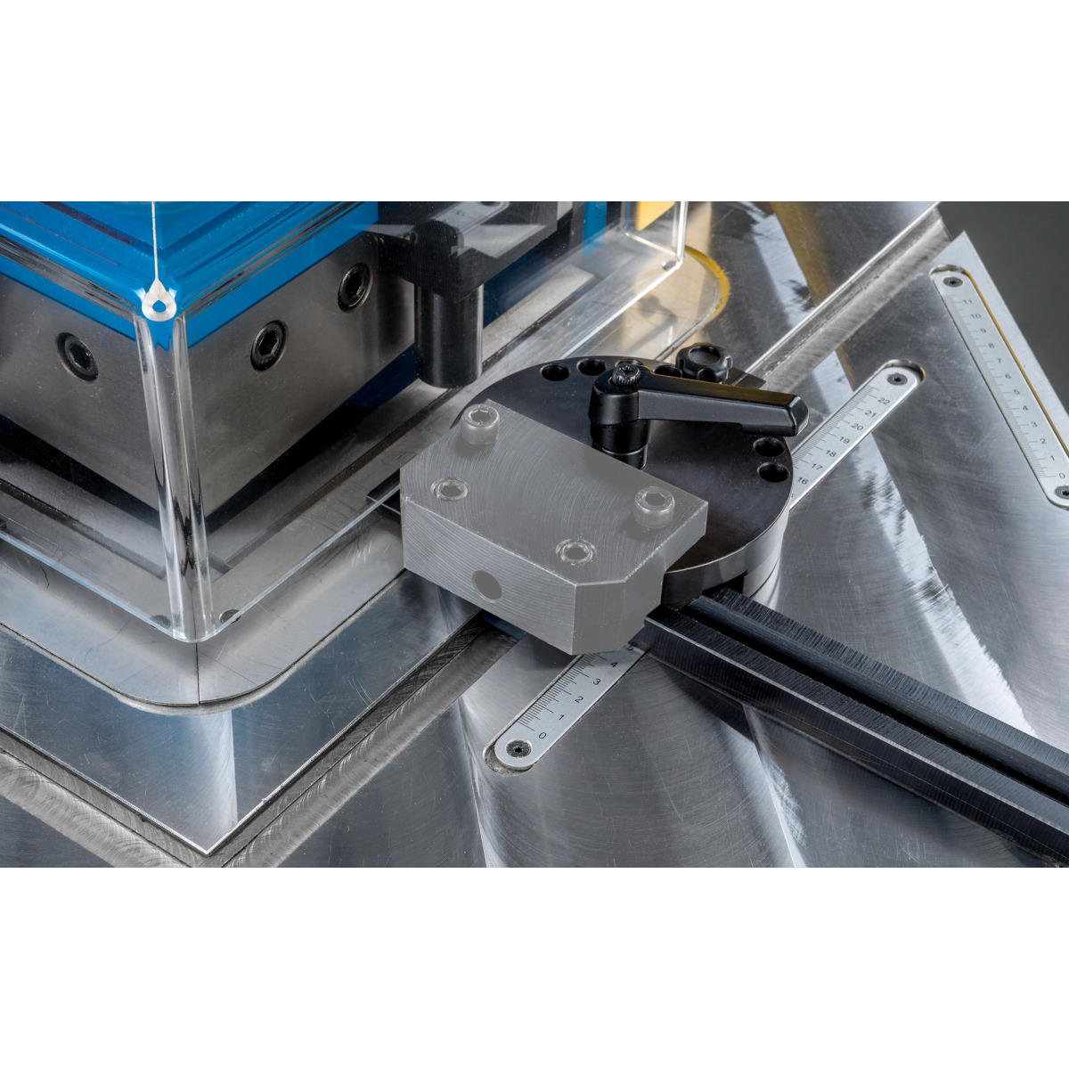 • Solider Tisch mit versenkten Skalen und T-Nuten für genaue Justierung der schwenkbaren Anschläge