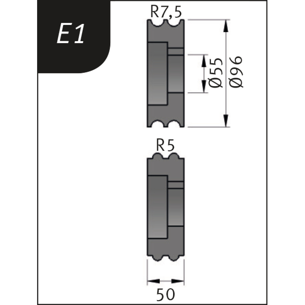Produktname: Metallkraft Biegerollensatz Typ E1, Ø 96 x 55 x 50 mm, R 7,5 / 5 mm 3880711