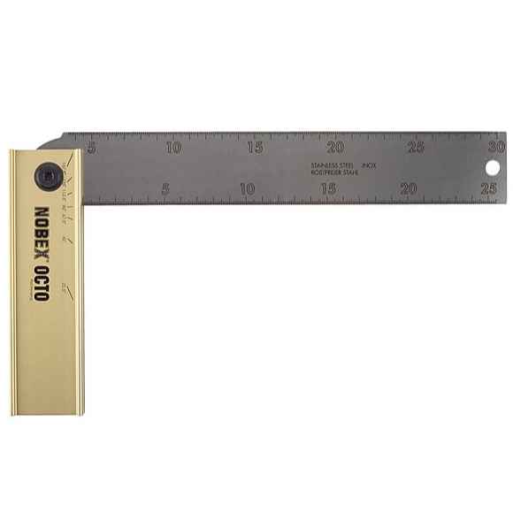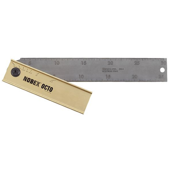 Nobex Oct ist ein Zusammenklappbar Gehrungswinkel mit acht Einrastungen, leicht auf- und zuzuklappen und eignet sich für die Tasche jedes Tischlers oder Schreiners. Die Genauigkeit bei der Winkeleinstellung ist +/- 0,05°. Das Lineal aus 45mm rostfreiem Stahl hat eine beidseitige, gravierte Skala. Der Griff besteht aus extrudiertem eloxiertem Aluminium mit einer extrem strapazierfähigen Oberfläche.