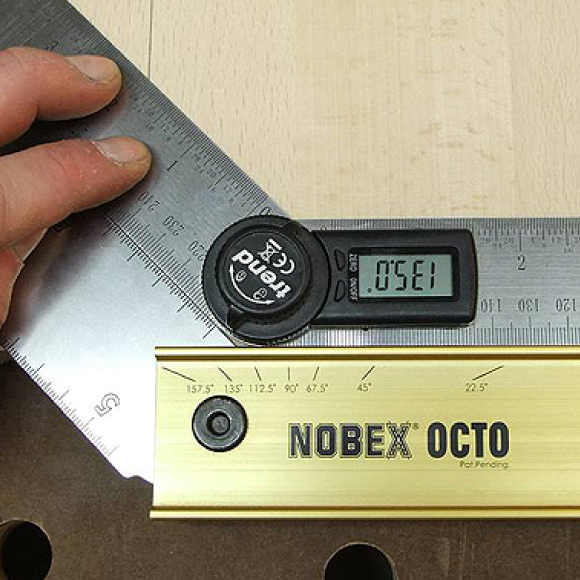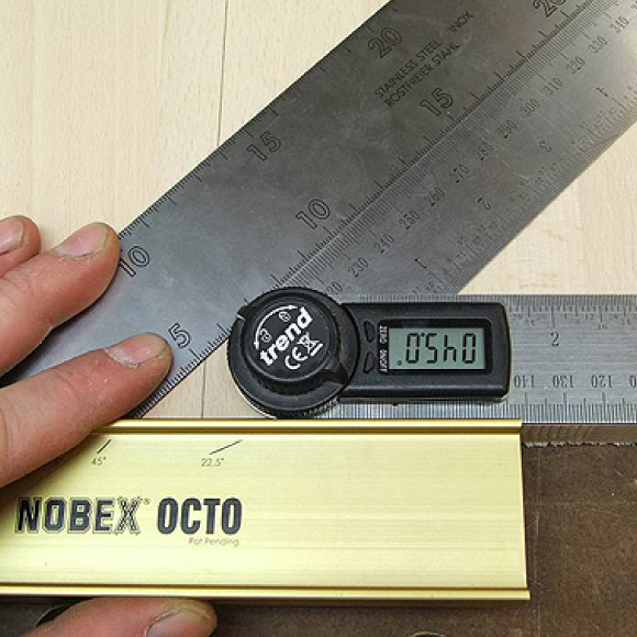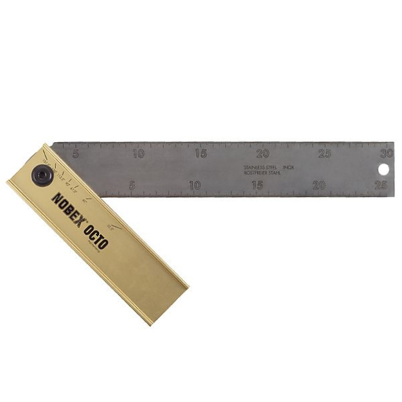 Nobex Oct ist ein Zusammenklappbar Gehrungswinkel mit acht Einrastungen, leicht auf- und zuzuklappen und eignet sich für die Tasche jedes Tischlers oder Schreiners. Die Genauigkeit bei der Winkeleinstellung ist +/- 0,05°. Das Lineal aus 45mm rostfreiem Stahl hat eine beidseitige, gravierte Skala. Der Griff besteht aus extrudiertem eloxiertem Aluminium mit einer extrem strapazierfähigen Oberfläche.