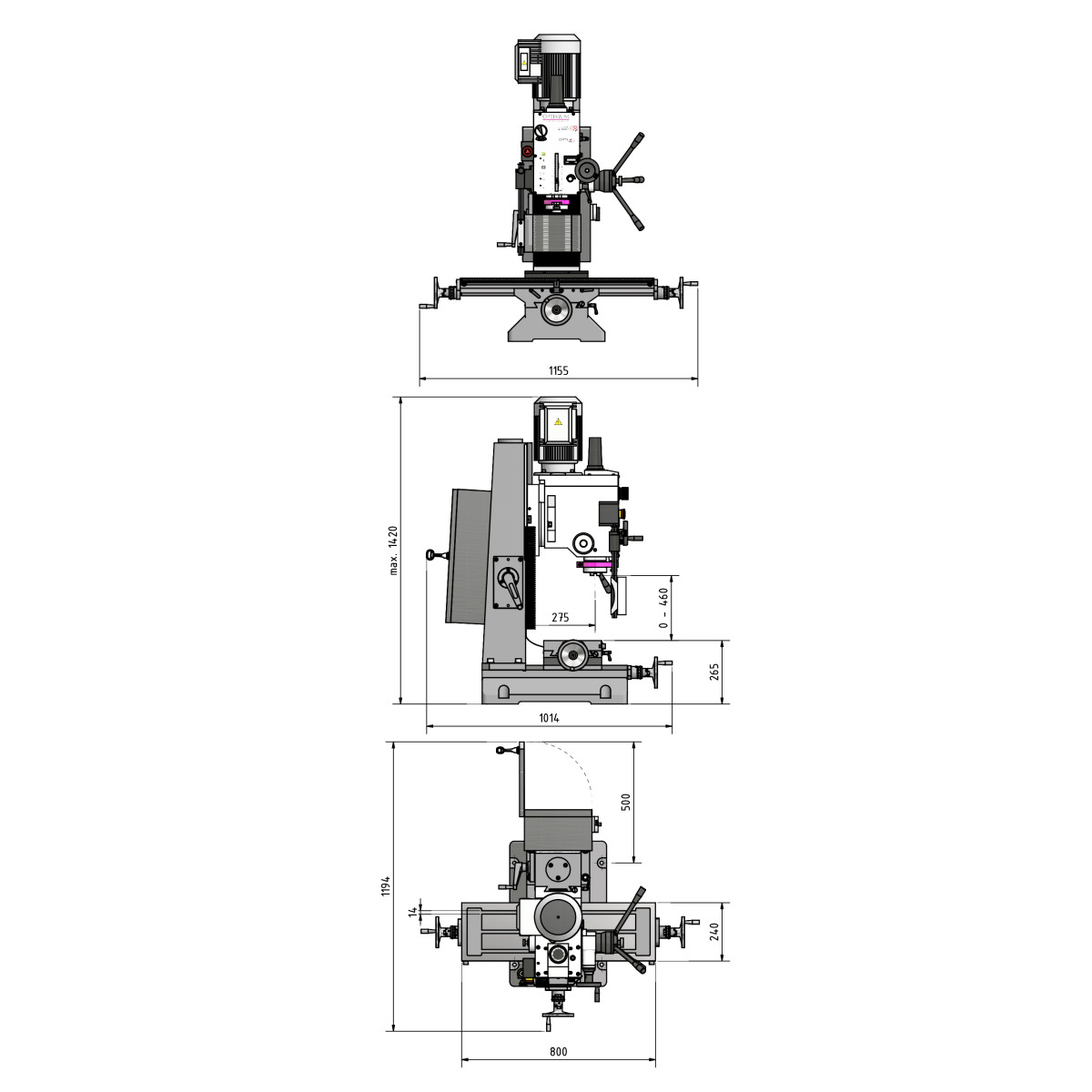 - Abstand Vertikalspindel – Horizontalfrästisch max.: 460 mm
