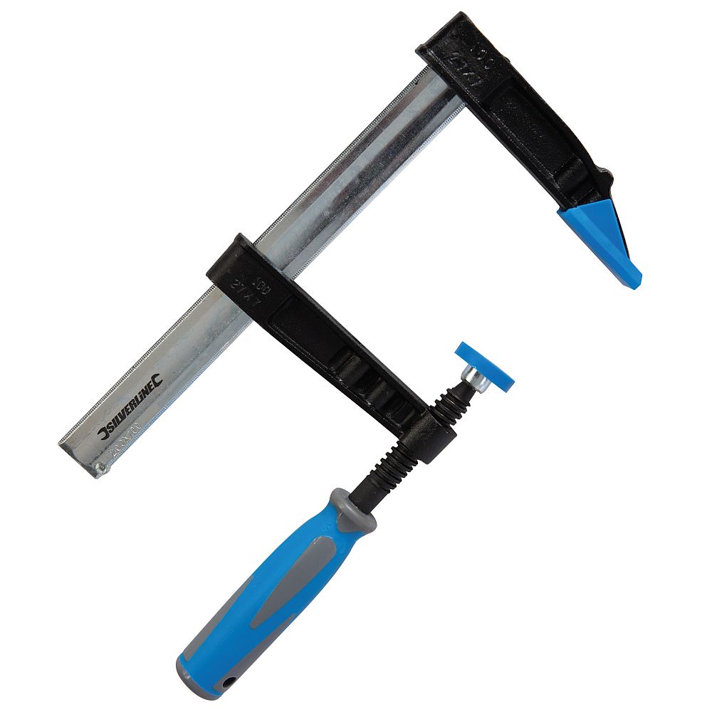 Massive Schraubzwinge mit profilierten Gussarmen mit Kunststoff-Schutzkappen und Softgrip-Griff.